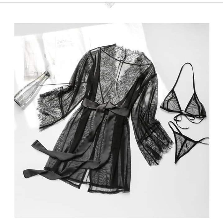 Sét choàng ngủ 3 món gồm: áo choàng ngoài, áo lót lưới cột dây, quần lưới sexy. Hàng ren cao cấp, chất mềm mại, sang trọng. Hai màu trắng đen, freesize.