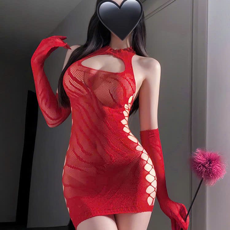 Hai bên hông được thiết kế kiểu đan lỗ cách điệu, vừa thoáng vừa tăng độ sexy cho tổng thể. Lưng khoét rộng kéo dài xuống hông, tôn trọn đường cong mềm mại. Mẫu còn đi kèm găng tay lưới đồng bộ tạo sự hài hòa và nâng cấp vẻ quyến rũ. Tông màu đỏ rực hoặc đen huyền bí đều mang lại cảm giác nổi bật, đầy sự cám dỗ nhưng không hề phản cảm nhờ họa tiết lưới xen kẽ tinh tế.