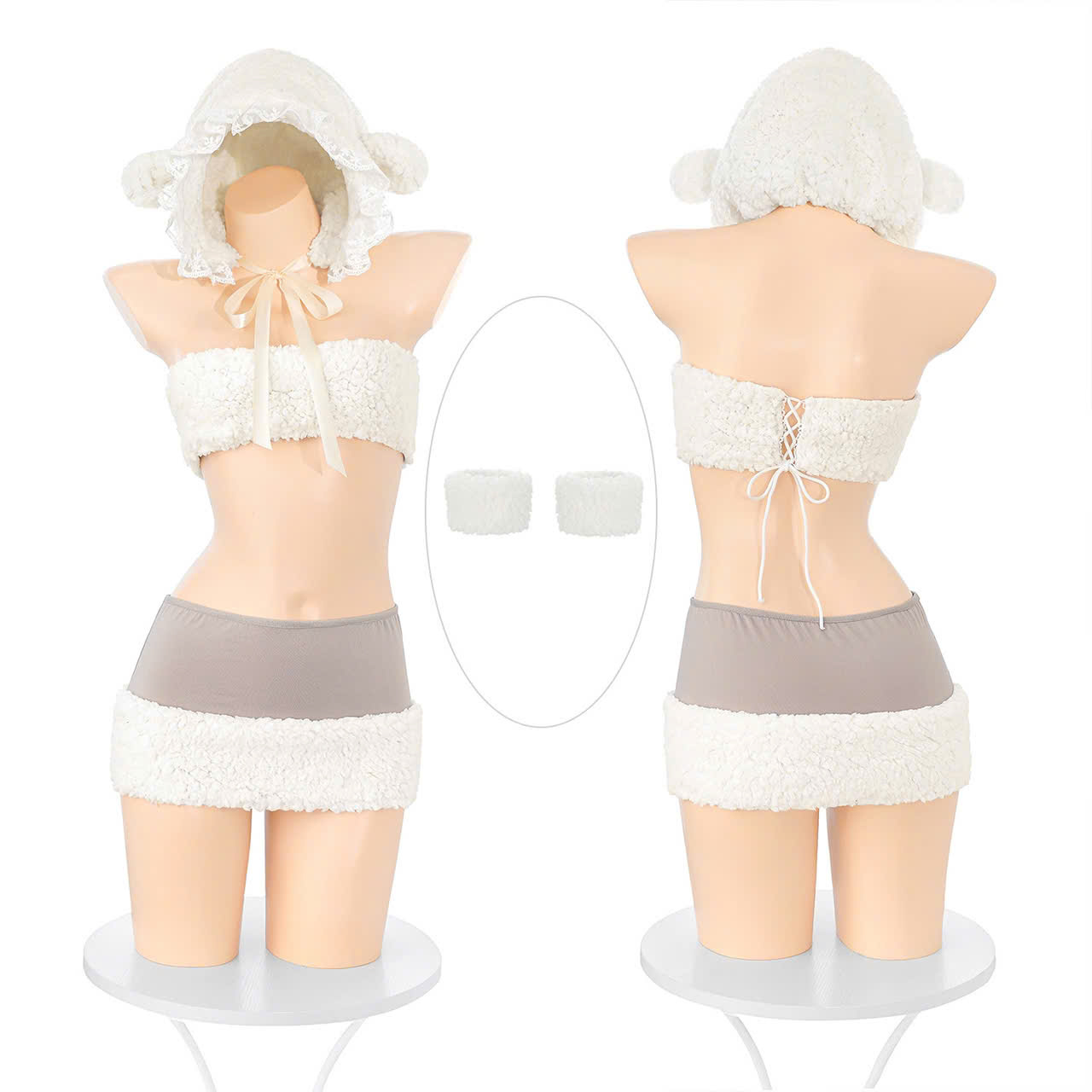 Mẫu cosplay “cừu bé nhỏ” này mang phong cách ngọt ngào, đáng yêu nhưng vẫn giữ được nét quyến rũ tinh tế. Bộ trang phục gồm áo quây lông mềm mịn phối chân váy ngắn ôm nhẹ, tạo dáng yêu kiều và tôn trọn vòng eo thon. Chất liệu lông trắng bồng mềm mang lại cảm giác ấm áp, dễ thương như một chú cừu non thực thụ. Set đồ đi kèm mũ bonnet viền bèo siêu xinh, vòng tay lông và tất lưới trắng giúp tổng thể thêm nổi bật và hài hòa.