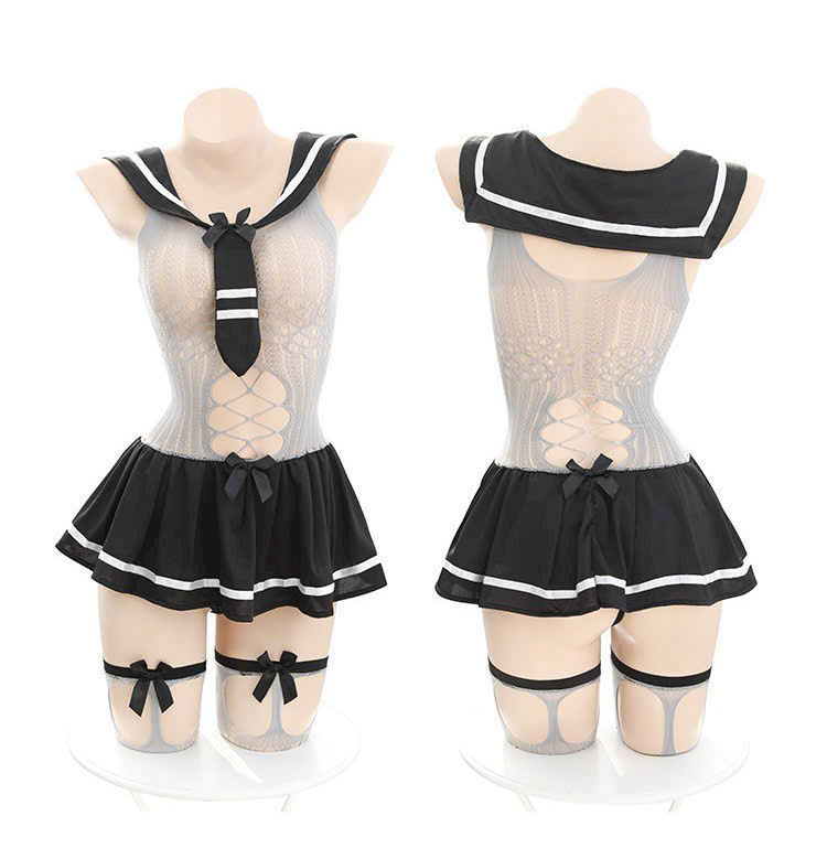 Mẫu cosplay đồng phục học sinh này mang phong cách trẻ trung pha chút quyến rũ táo bạo, với thiết kế dáng sailor (thuỷ thủ) cực dễ thương. Phần áo được làm từ chất liệu lưới mềm co giãn, tạo độ ôm vừa phải và hiệu ứng xuyên thấu tinh tế. Chi tiết dây đan chéo trước bụng giúp tôn vòng eo thon, đồng thời tạo điểm nhấn nổi bật cho bộ trang phục.