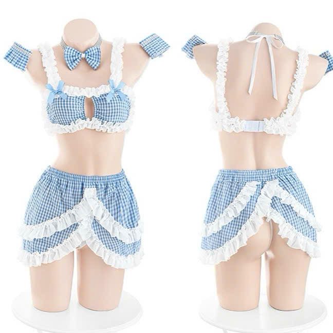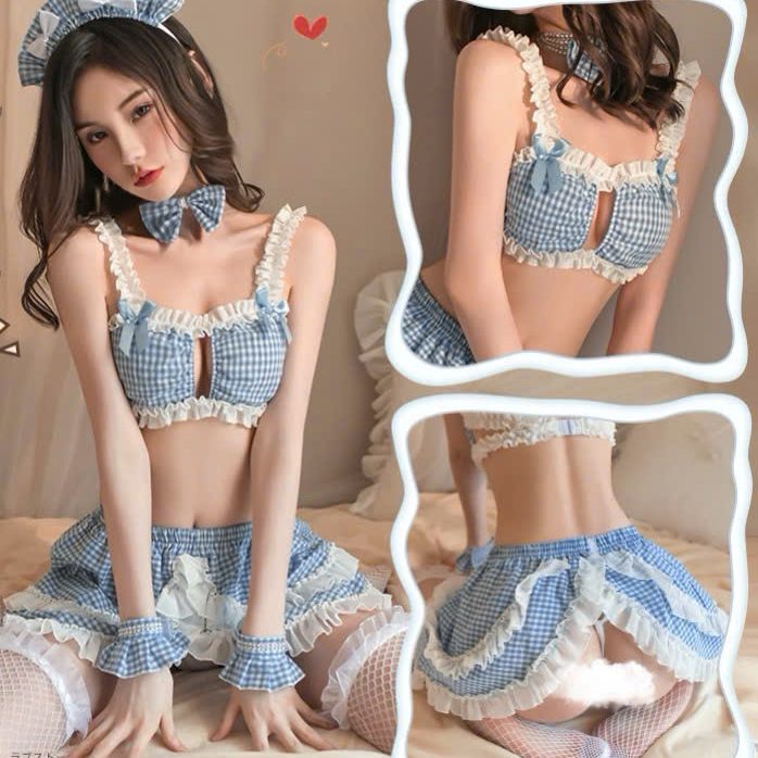 Bộ trang phục sử dụng chất liệu Cotton mềm mại, thoáng mát, mang lại cảm giác thoải mái và dễ chịu khi mặc. Phần ren trang trí ở cổ áo và tay áo tạo thêm nét nữ tính và dịu dàng cho bộ đồ. Bộ trang phục có màu xanh chủ đạo, kết hợp với những đường viền ren trắng, tạo sự hài hòa và thanh lịch. Màu xanh mang đến cảm giác nhẹ nhàng, trong sáng và dễ thương.