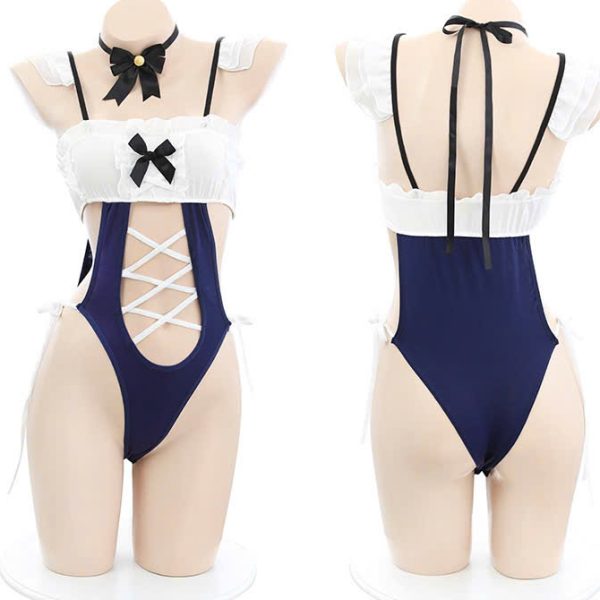 Trang phục sử dụng hai tông màu chủ đạo là trắng và xanh, vừa tạo cảm giác tươi mới, trẻ trung, vừa tôn lên nét gợi cảm một cách tinh tế. Thiết kế cut-out hai bên hông giúp khoe trọn vòng eo thon gọn và tạo điểm nhấn mạnh mẽ, làm nổi bật các đường cong cơ thể. Phần bụng được thiết kế với các dây đan chéo từ hai bên, vừa giúp giữ form trang phục vừa tạo nên vẻ đẹp quyến rũ, bí ẩn. Phần váy ngắn kết hợp với viền ren hoặc bèo, làm tăng thêm nét nữ tính và đáng yêu. Cổ áo có thể là cổ yếm để làm nổi bật phần cổ và xương quai xanh, tạo nên sự thanh thoát, quyến rũ. Phụ kiện đi kèm gồm một vòng cổ kiểu choker, mang lại phong cách bí ẩn và gợi cảm cho người mặc. Vòng cổ choker này làm nổi bật vùng cổ, tạo cảm giác hài hòa với thiết kế tổng thể của bộ trang phục.