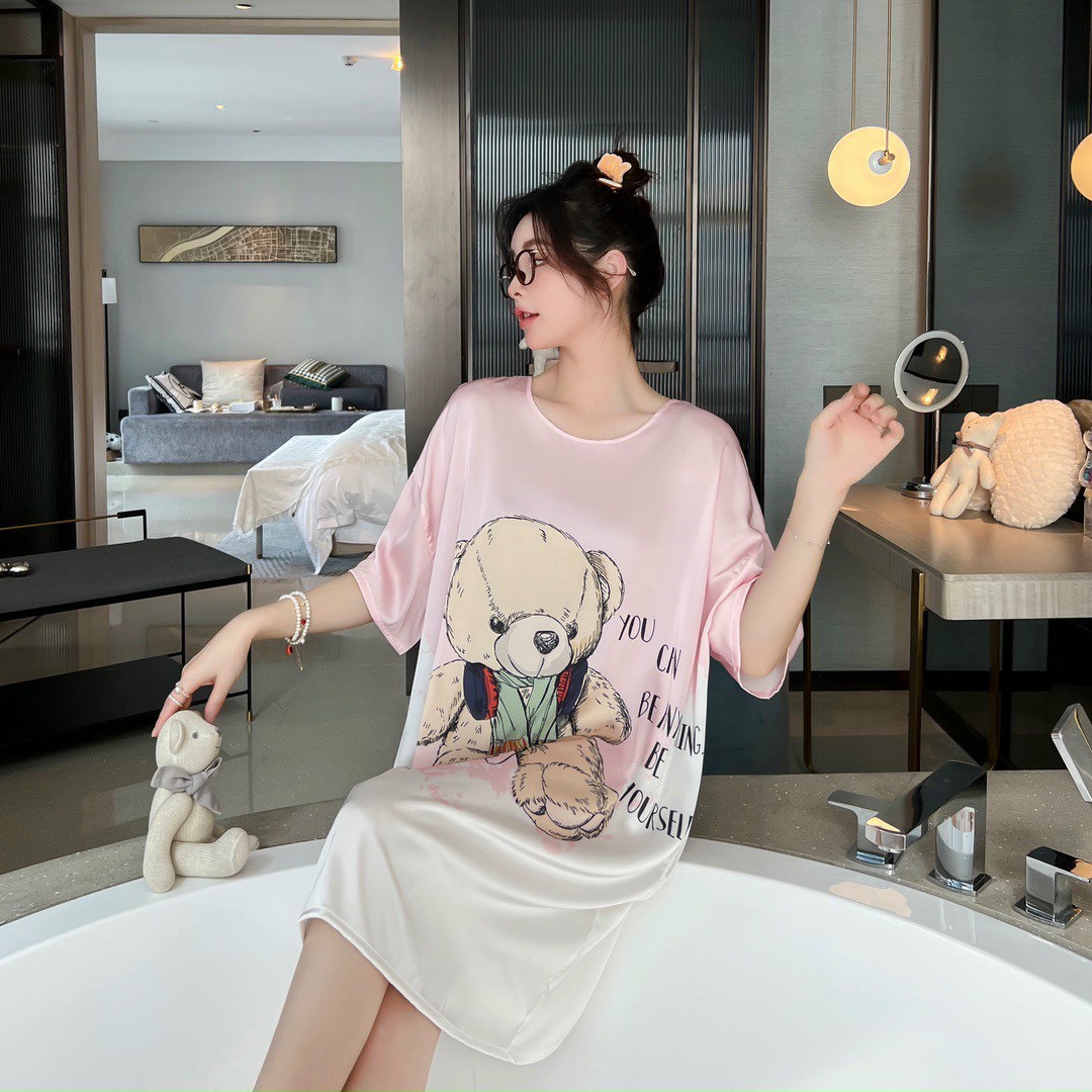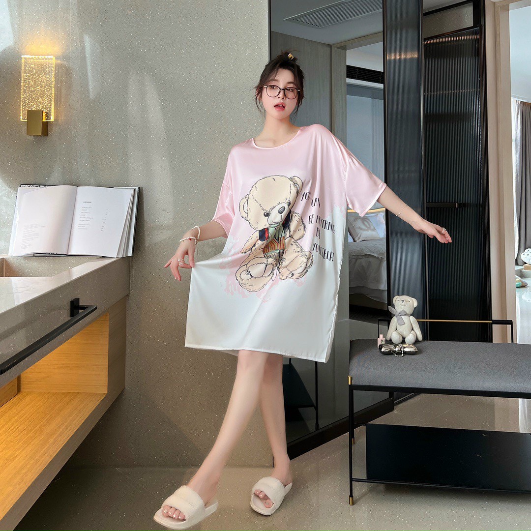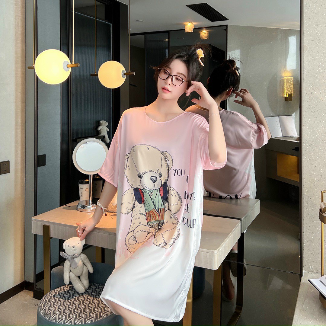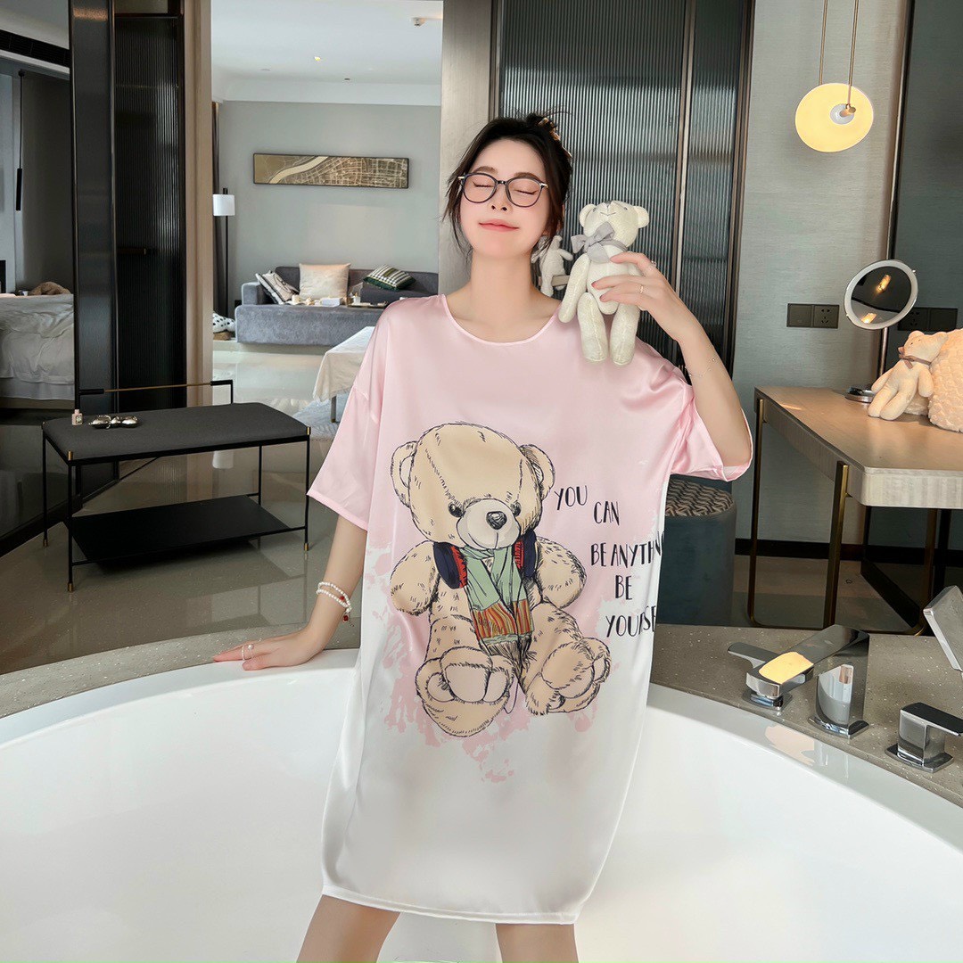 Chất liệu lụa họa tiết in sắc nét gấu teddy cute đáng yêu kiểu dáng đầm ngủ sơ mi phôm rộng mang lại cho bạn gái sự thoải mái dễ chịu khi mặc. Màu sắc: hồng, xanh.
