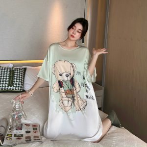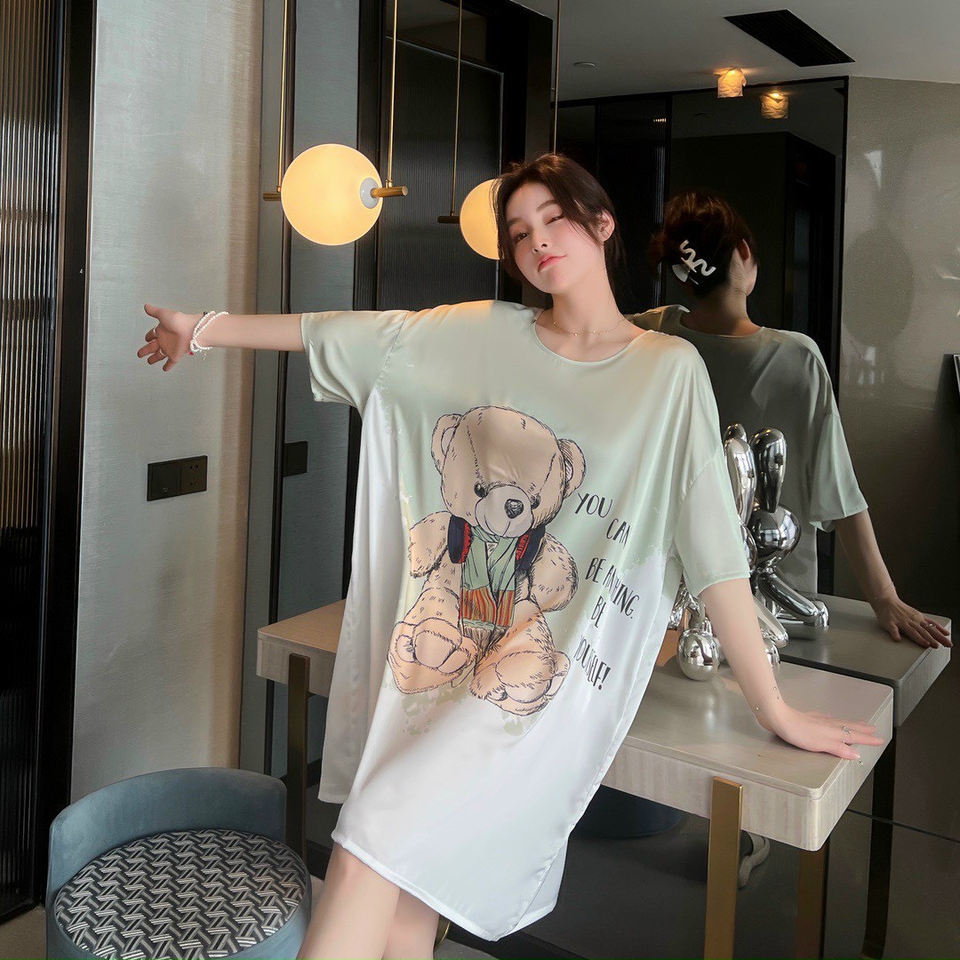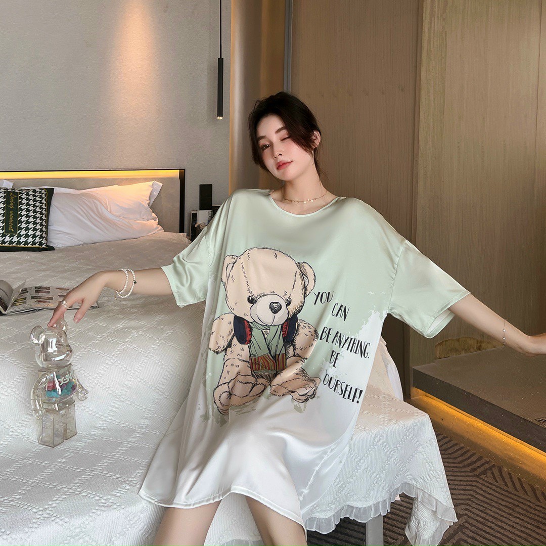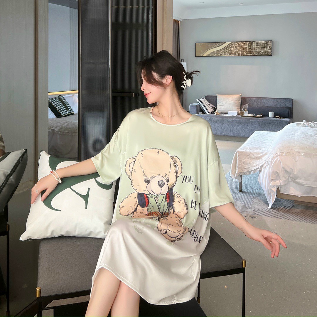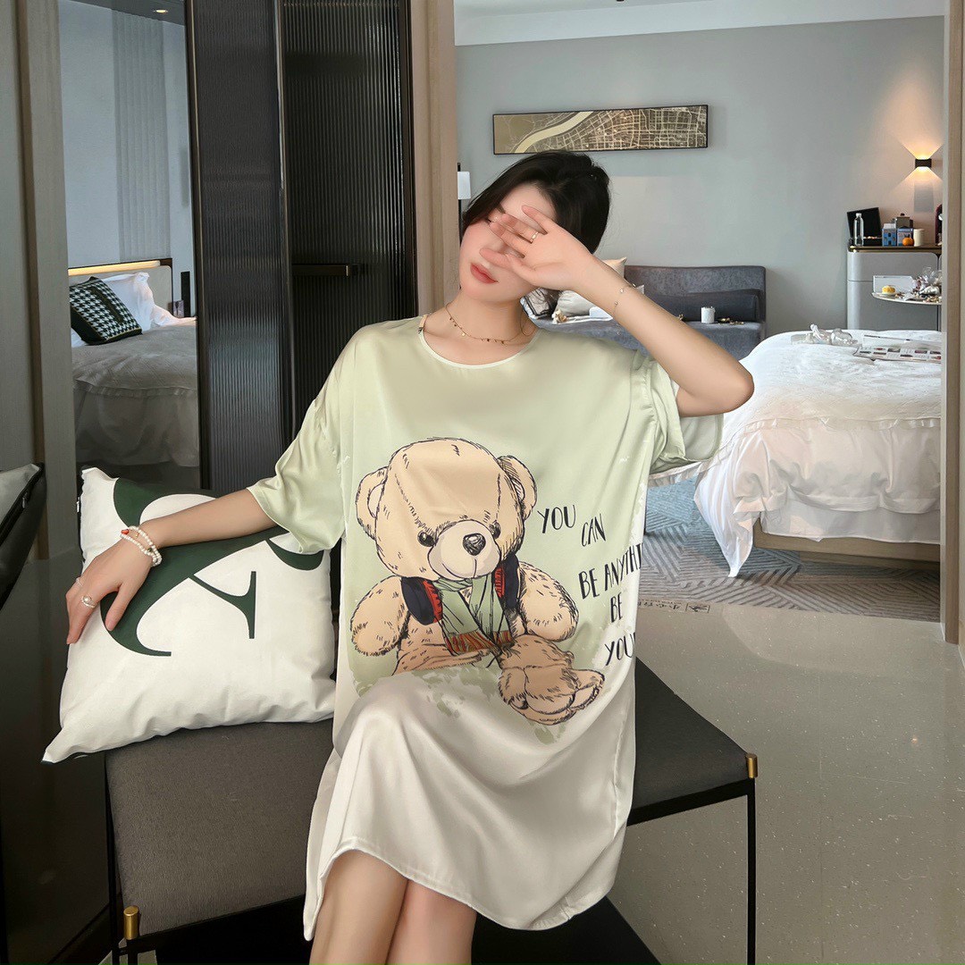 Chất liệu lụa họa tiết in sắc nét gấu teddy cute đáng yêu kiểu dáng đầm ngủ sơ mi phôm rộng mang lại cho bạn gái sự thoải mái dễ chịu khi mặc. Màu sắc: hồng, xanh.