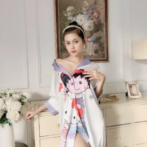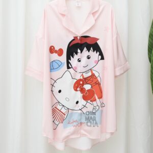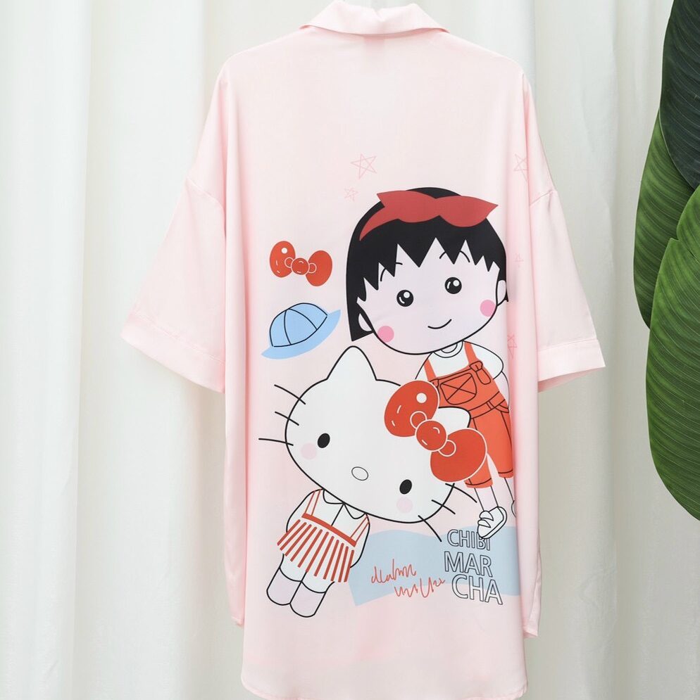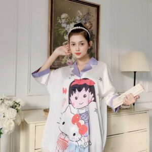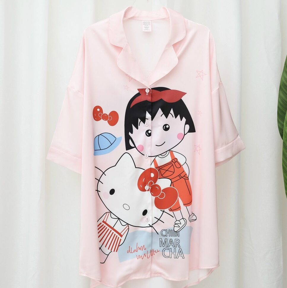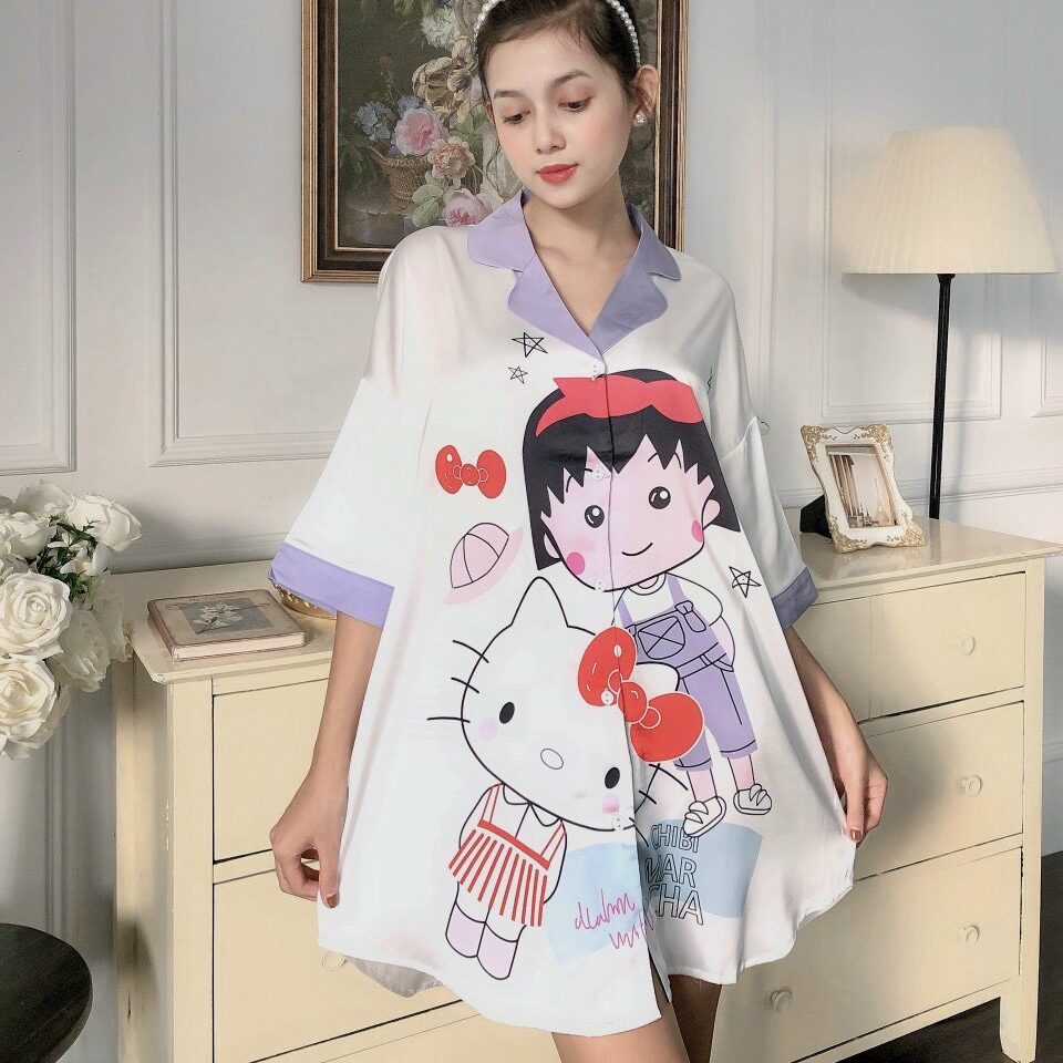 Đầm ngủ sơ mi chất liệu lụa cao cấp mềm mịn không nhăn hoạ tiết cô bé chi bi đáng yêu cute. Hai màu: hồng, xanh.