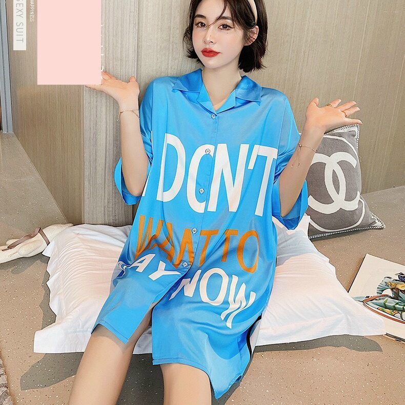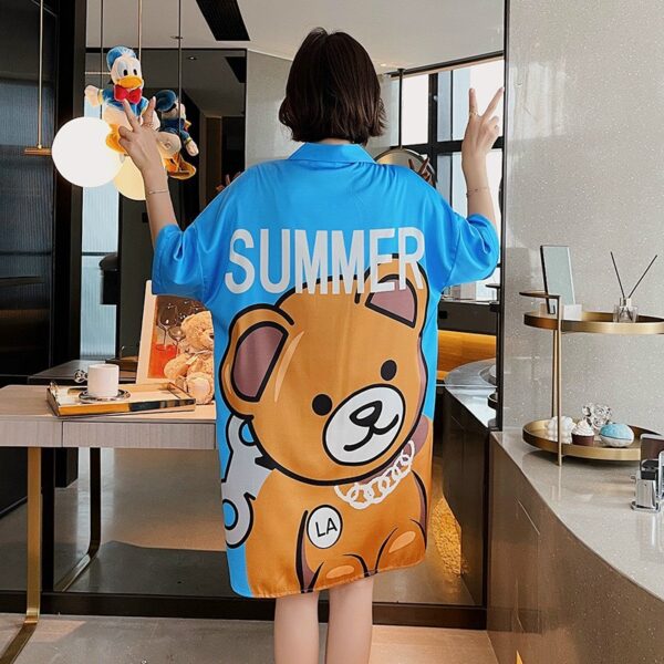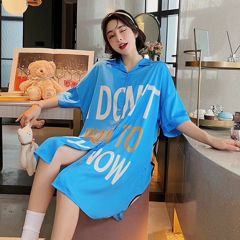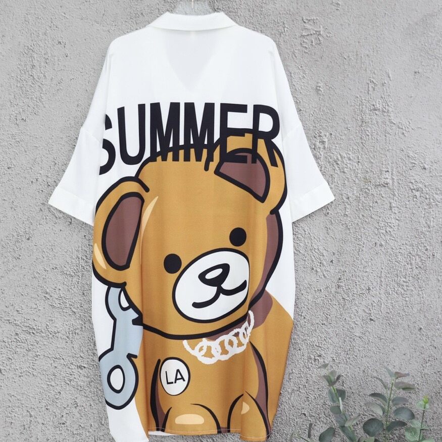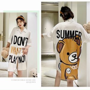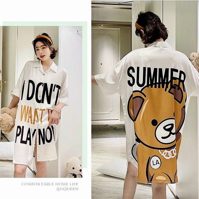 Đầm ngủ sơ mi chất lụa mềm mại phôm rộng mặc cực thích họa tiết gấu cute cực to cho nàng vẻ đáng yêu ngây thơ. Màu: trắng, xanh.