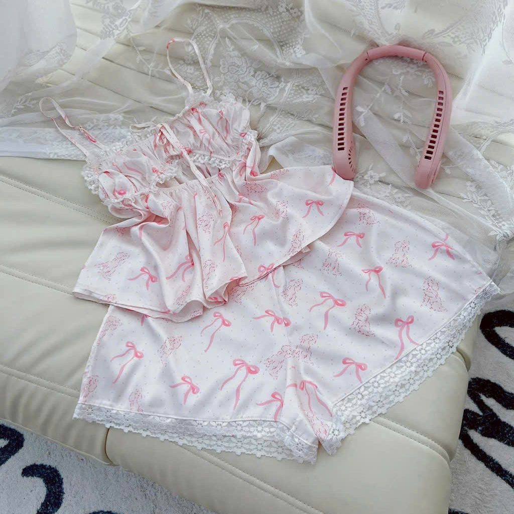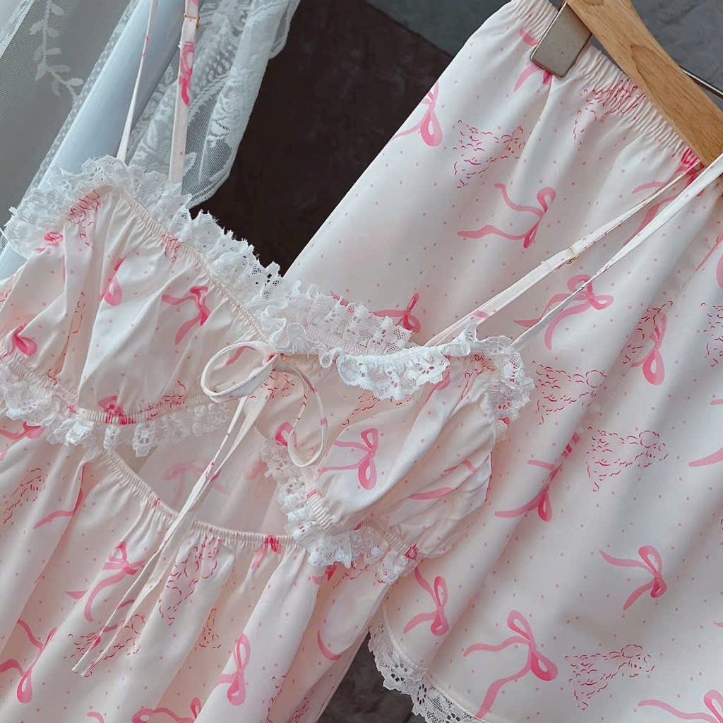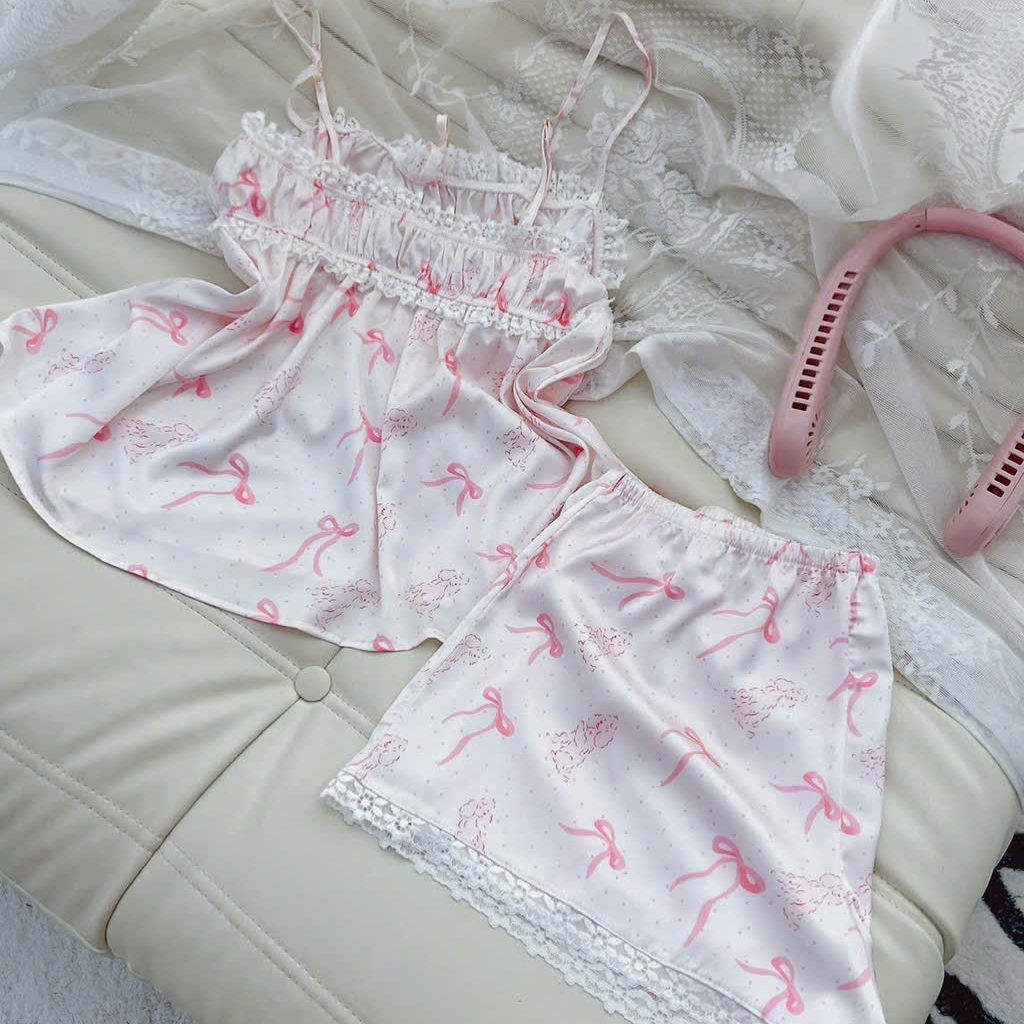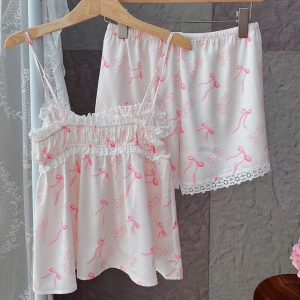 Set đồ ngủ lụa họa tiết nơ hồng mang đến cảm giác nhẹ nhàng và dễ thương ngay từ cái nhìn đầu tiên. Áo hai dây bản mảnh, dáng suông thoải mái, phần ngực và thân áo được nhún bèo cùng đường ren trắng mềm mại tạo sự nữ tính tinh tế. Quần short cùng họa tiết tông xuyệt tông, cạp chun co giãn dễ mặc, viền ren phía dưới tăng thêm nét đáng yêu. Chất vải lụa mềm, mịn, mát da giúp nàng dễ chịu suốt đêm. Tông màu hồng pastel kết hợp họa tiết nơ xinh xắn phù hợp cho những ngày muốn “nâng mood” nhẹ nhàng và thư giãn trong không gian riêng của mình.