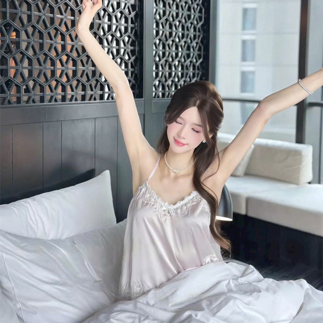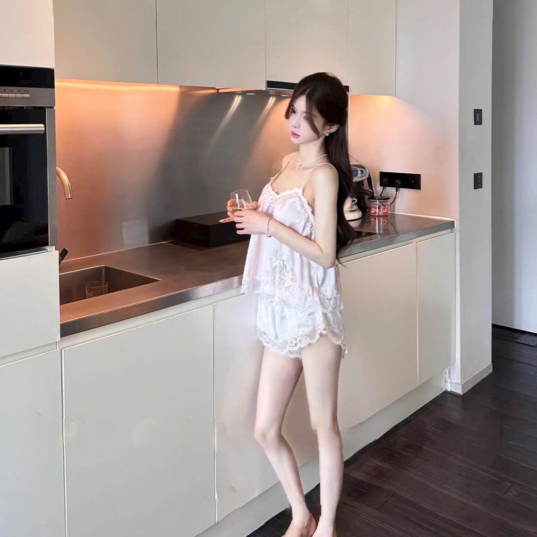 Một thiết kế mang vibe “nàng thơ tại gia” – set đồ ngủ 2 dây chất lụa mềm mịn, phối ren tinh tế giúp tôn lên vẻ đẹp dịu dàng nhưng vẫn đầy cuốn hút. Phù hợp cho những buổi tối thư giãn hoặc sáng sớm chill nhẹ với một tách trà