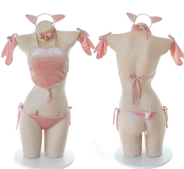 Đồ ngủ cosplay heo hồng cute, nguyên sét bao gồm: cài tóc, vòng cổ, bao tay, yếm, quần lót.