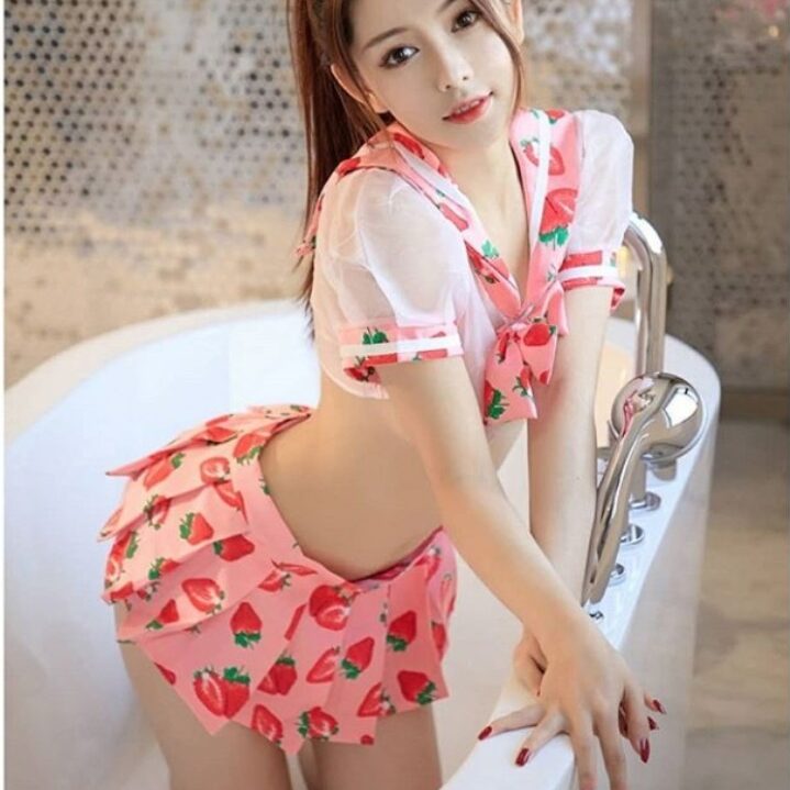 Trang phục cosplay học sinh áo trong suốt váy ngắn họa tiết dâu tây siêu cute cho bạn gái khoảnh khắc ngây thơ gợi cảm.