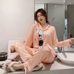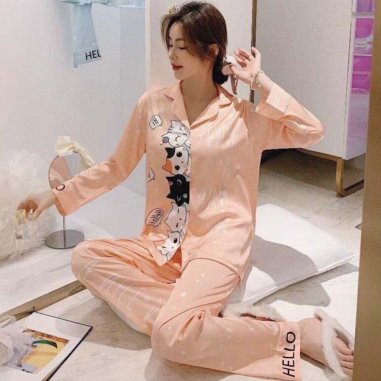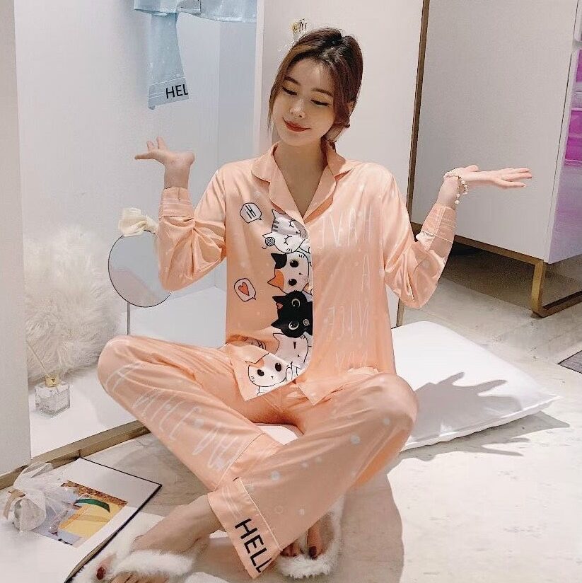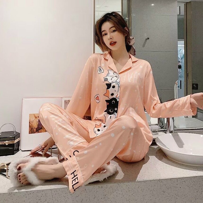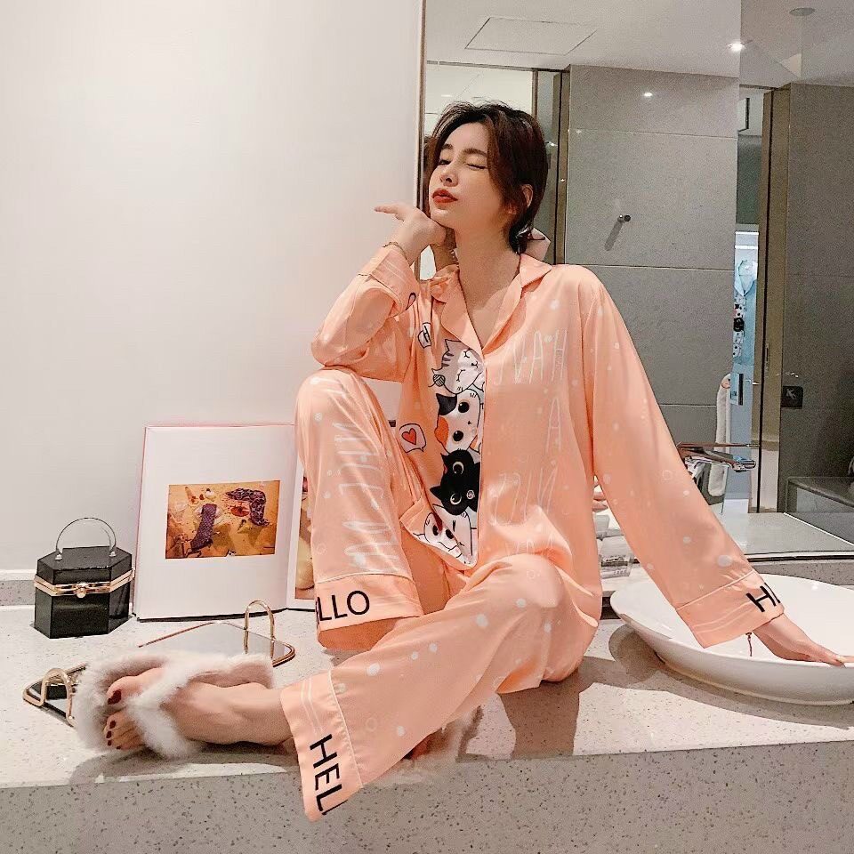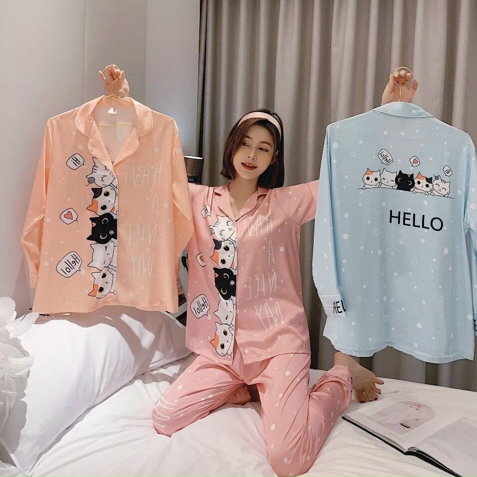Chất liệu lụa cao cấp mềm mịn kiểu dáng pijma dài tay dài họa tiết đàn mèo cute đáng yêu cho nàng sự thoải mái tự tin khi ra phố hay ở nhà.