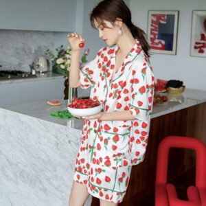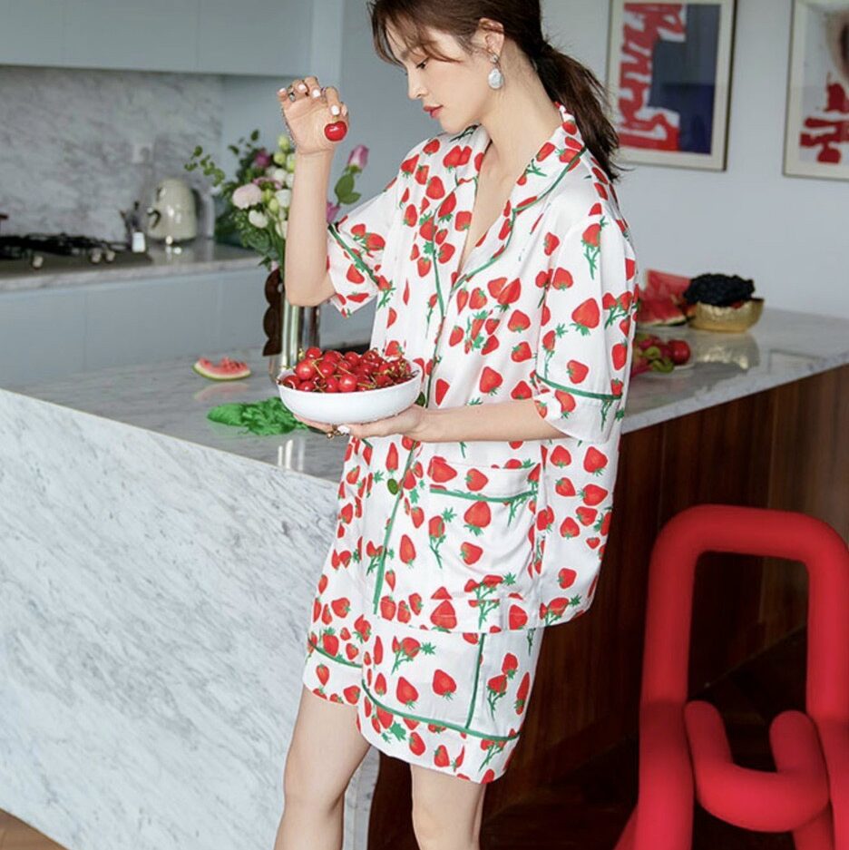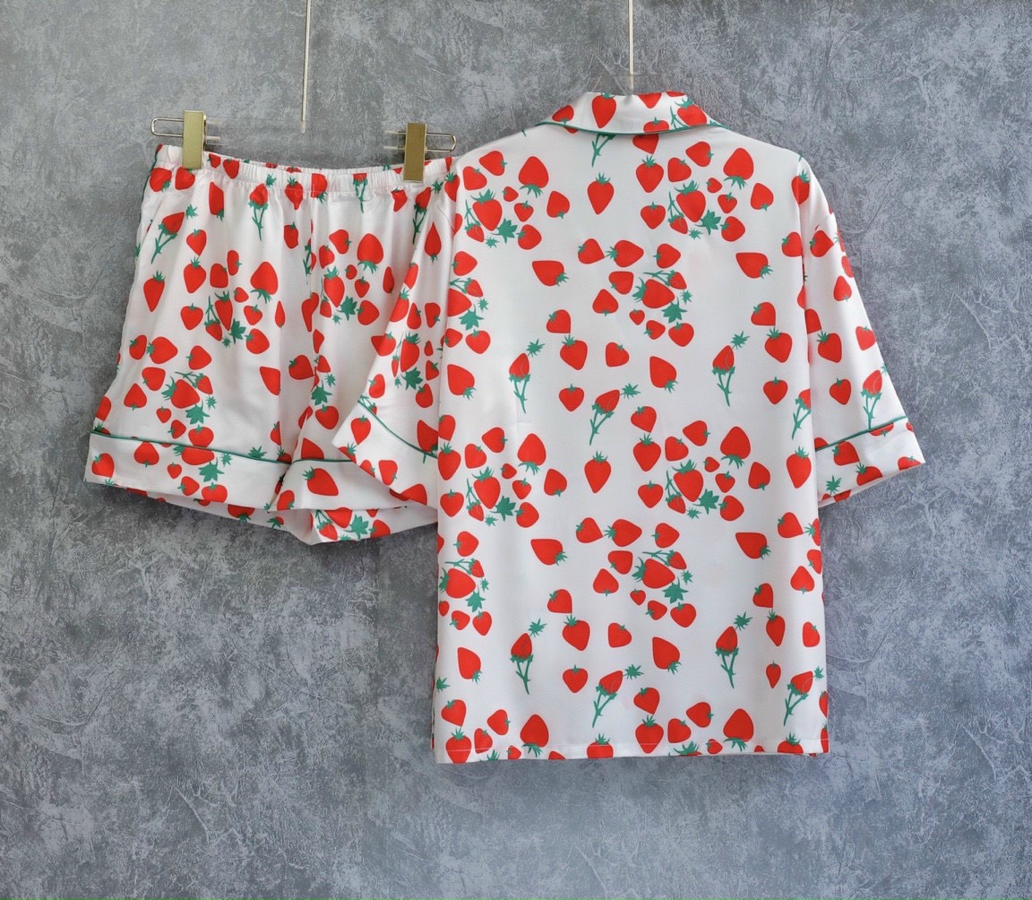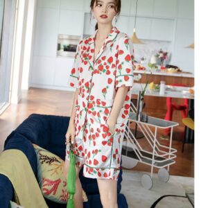 Chất liệu lụa mềm mịn họa tiết dâu tây đáng yêu, kiểu dáng đùi ngắn tay mang đến cho bạn sự thoải mái nét đẹp đáng yêu khi ở nhà.