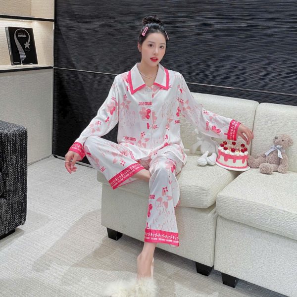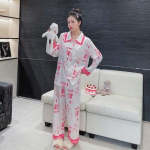 Bộ đồ ngủ pijama làm từ lụa cao cấp, mang lại cảm giác mềm mại và mịn màng, giúp người mặc thoải mái và dễ chịu suốt cả đêm. Chất liệu lụa nhẹ nhàng, bóng bẩy, thoáng mát, tạo nên sự sang trọng nhưng vẫn rất dễ chịu khi tiếp xúc với da. Bộ đồ được thiết kế với họa tiết cute đáng yêu, tạo nên vẻ trẻ trung và tinh nghịch. Thiết kế truyền thống của pijama với áo tay dài và quần dài tạo nên phong cách thanh lịch, vừa vặn, lý tưởng cho những ai yêu thích sự thoải mái và đáng yêu trong trang phục ngủ hàng ngày.