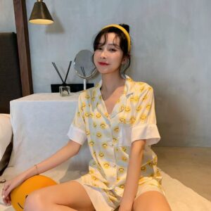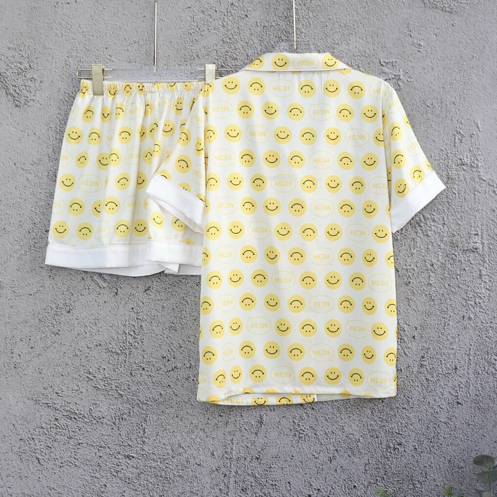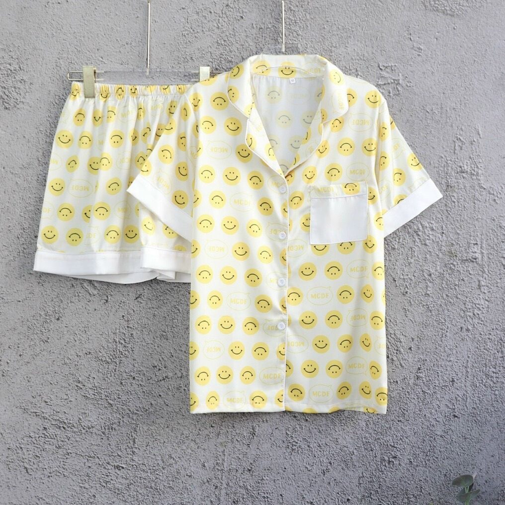 Đồ ngủ pijama họa tiết mặt cười cute kiểu dáng ngắn tay ngắn chất liệu lụa mềm mịn mang lại cho bạn cảm giác thoải mái và tự tin khi ở nhà.