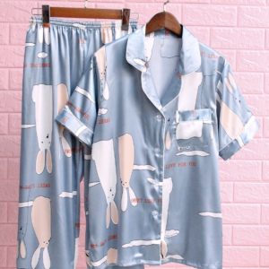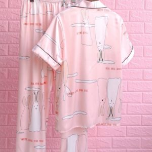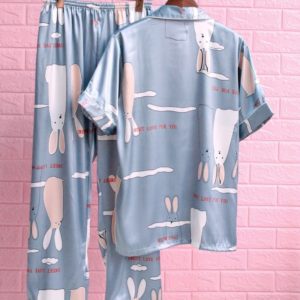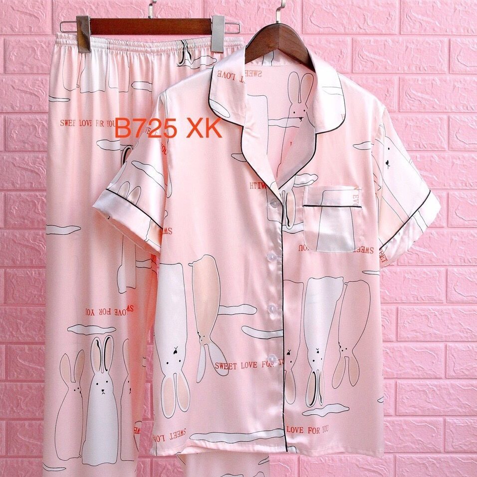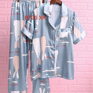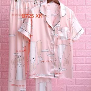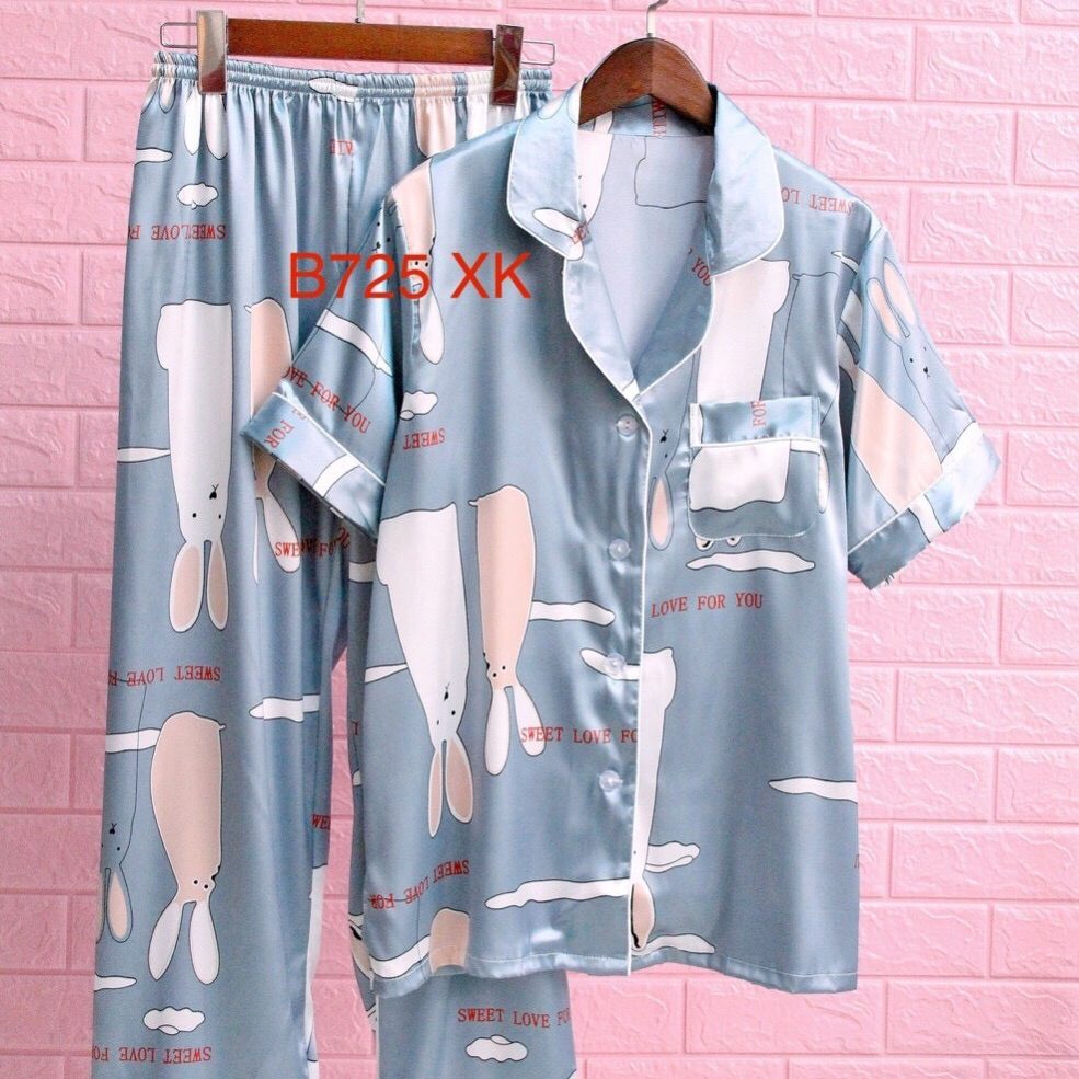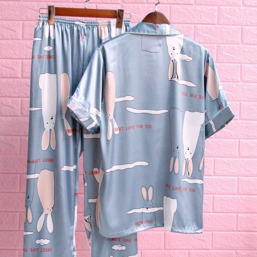 Đồ ngủ pijama chất liệu lụa mềm mịn kiểu dáng tay ngắn quần dài họa tiết thỏ cute sang chảnh mang lại cho bạn gái vẻ tự tin thoải mái khi mặc. Màu: hồng, xanh.