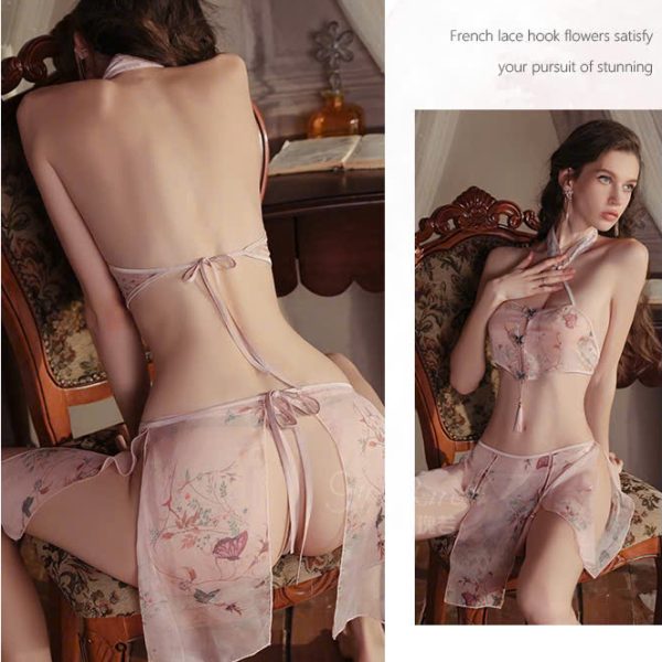 Phía trước: phần ngực phủ nhẹ bằng lớp voan mỏng in họa tiết hoa lá tinh tế, kết hợp chi tiết dây buộc rủ dài tạo điểm nhấn uyển chuyển. Vạt váy buông hờ hững, xẻ tà hai bên, gợi cảm mà vẫn thanh thoát.