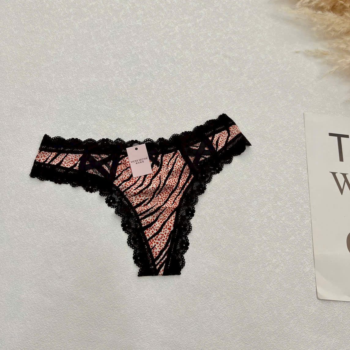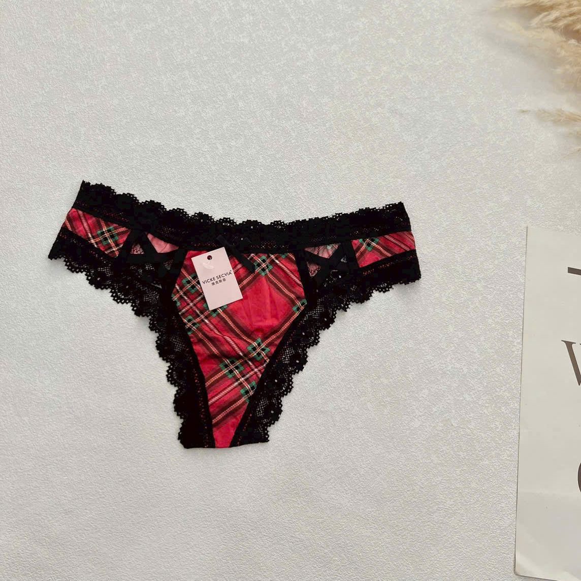Thiết kế quần lót phối ren kết hợp họa tiết nổi bật (caro/animal print) mang lại cảm giác vừa cá tính vừa nữ tính. Form ôm gọn, tôn dáng nhẹ nhàng, phù hợp cho nàng thích style độc đáo nhưng vẫn thoải mái.