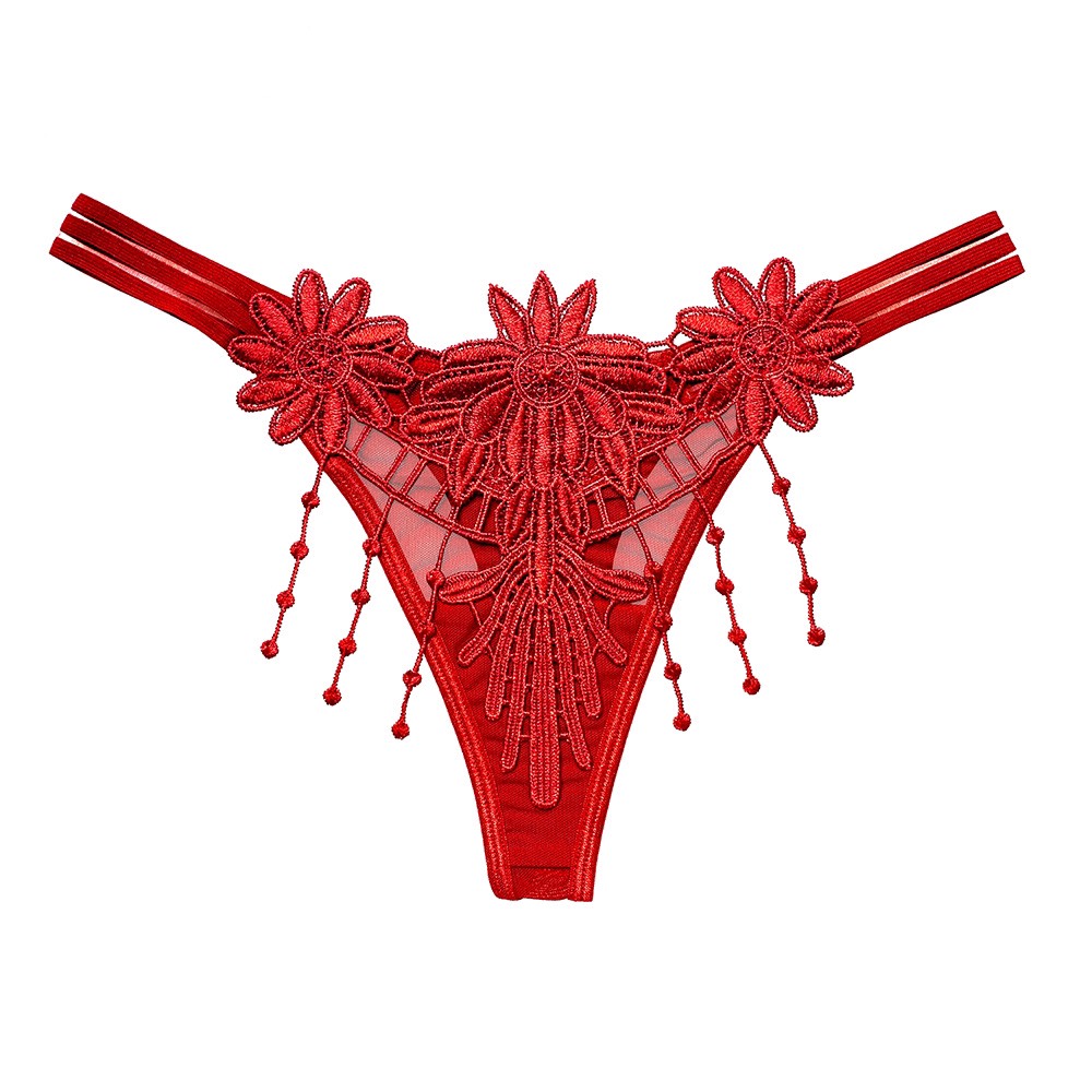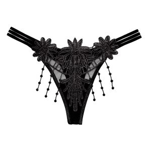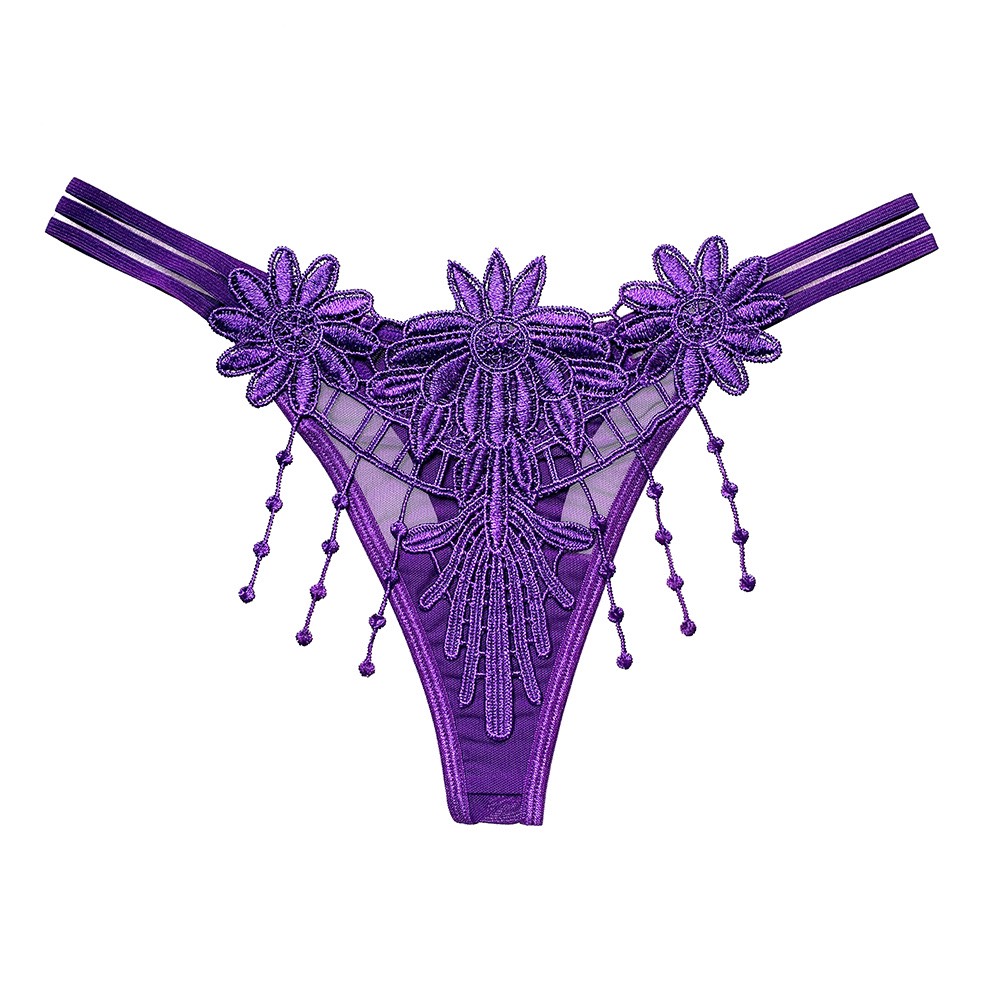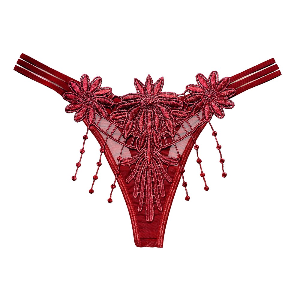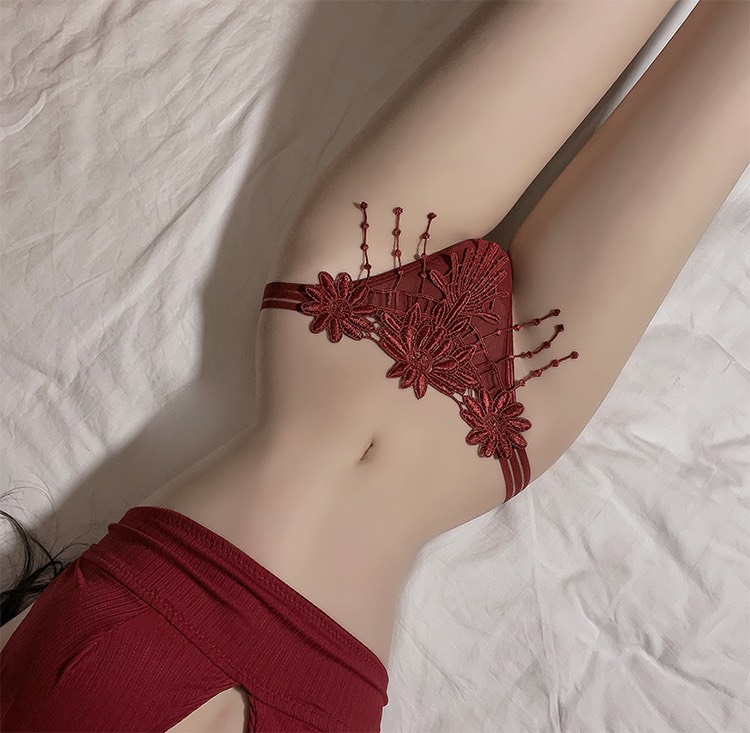 Quần lót ren hoạ tiết bông hoa phối dây kiểu dáng gợi cảm. Màu sắc: đen, đỏ, tím.