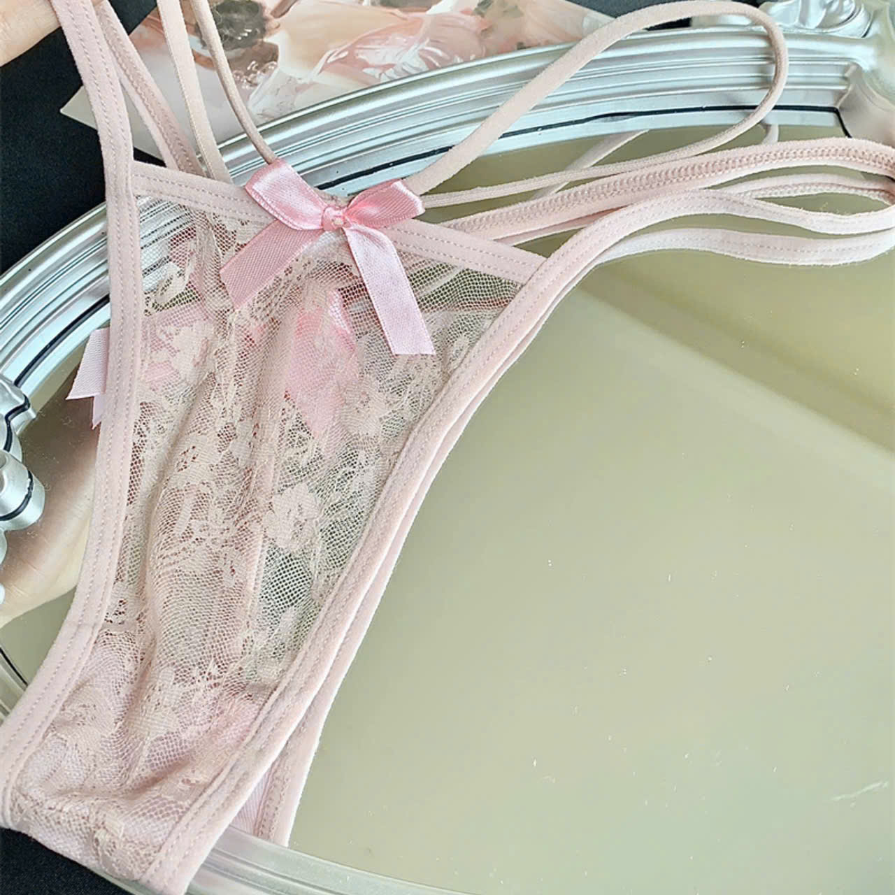Chất liệu ren mỏng, mềm mại, ôm sát cơ thể, tạo nên sự quyến rũ và nữ tính mà không gây cảm giác khó chịu. Thiết kế lọt khe táo bạo, khoe trọn vẹn vòng ba một cách khéo léo, mang lại vẻ ngoài đầy cuốn hút. Phần phía trước của quần được thiết kế với ren tinh tế, trang nhã, trong khi hai bên hông được phối dây đan chéo hoặc dây mảnh, tạo nên nét mềm mại nhưng vẫn mang phong cách quyến rũ, hiện đại. Phối dây không chỉ giúp làm nổi bật phần hông mà còn tạo thêm điểm nhấn gợi cảm.