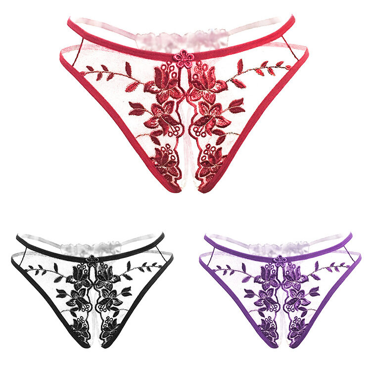 Quần lót ren thêu họa tiết cây hoa kiểu dáng quần xẻ đáy cực quyến rũ cho nàng. Màu: đen, đỏ, tím.