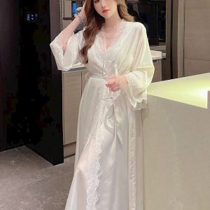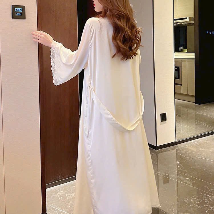Áo choàng dài đồng bộ với váy, được thiết kế rộng rãi, có dây buộc ở eo giúp người mặc dễ dàng điều chỉnh theo ý thích. Áo choàng mang lại sự thanh lịch và kín đáo nhưng không kém phần sang trọng, hoàn hảo để khoác ngoài váy ngủ khi cần di chuyển quanh nhà. Viền áo và tay áo được trang trí bằng ren họa tiết tinh tế để tăng thêm nét quý phái.