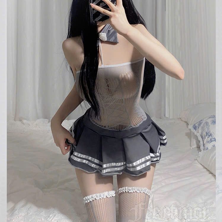 Đồ ngủ cosplay học sinh màu xám kết hợp giữa sự đáng yêu và quyến rũ với các chi tiết ôm sát cơ thể và thiết kế ngắn, giúp tôn lên vóc dáng người mặc. Trang phục này thường được sử dụng trong các buổi cosplay, tiệc tùng, hoặc chụp ảnh theo phong cách gợi cảm nhưng vẫn giữ được nét tinh tế.