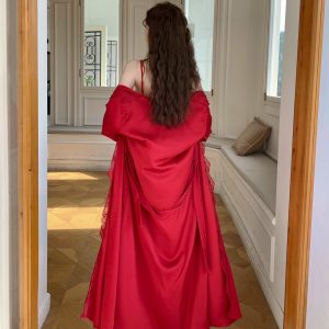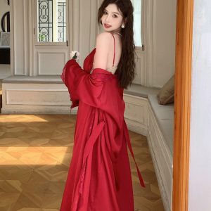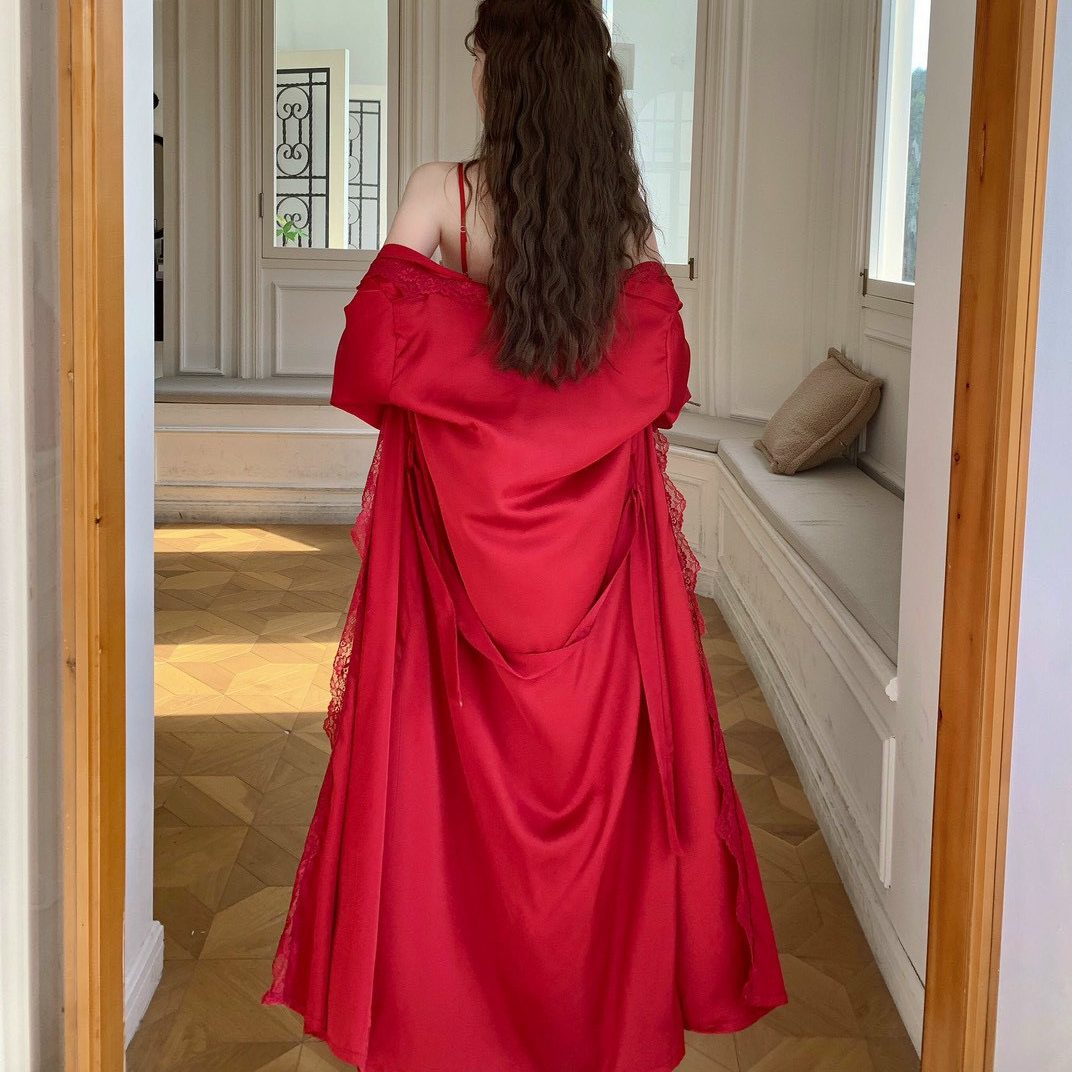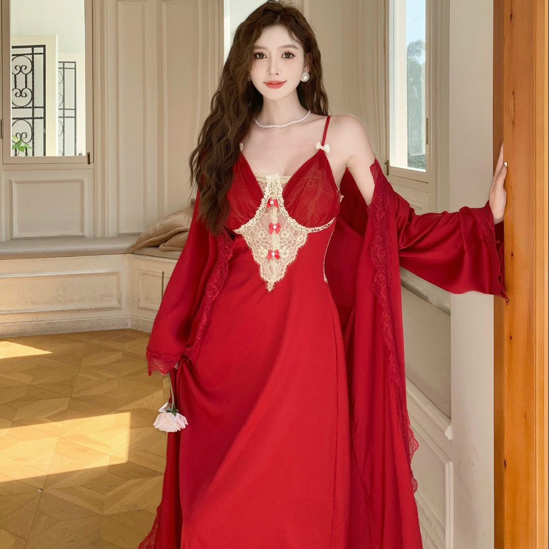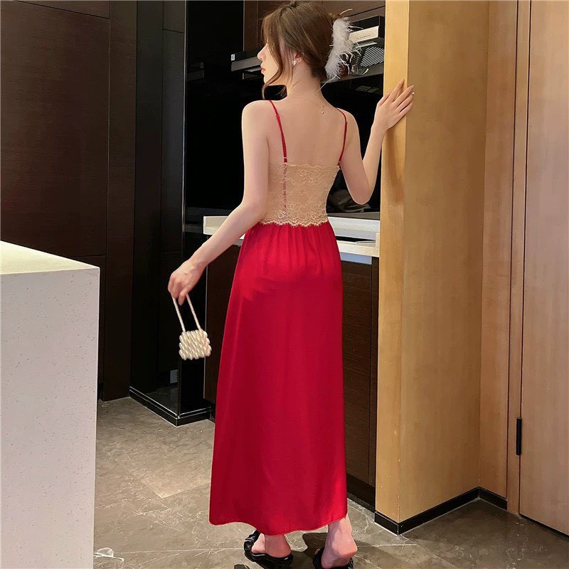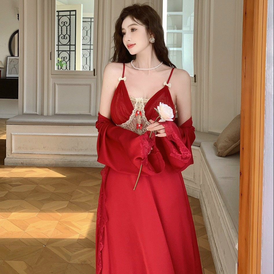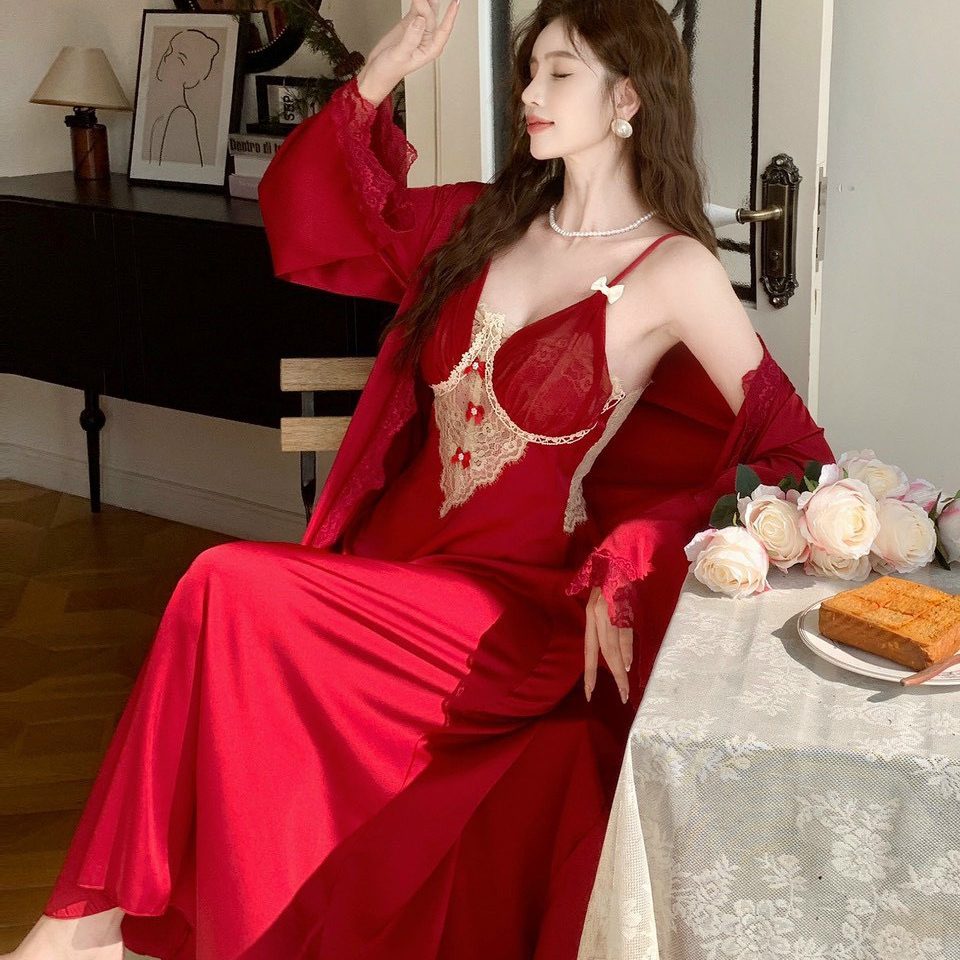 Váy ngủ dài phối ren kèm choàng lụa sang trọng mang lại vẻ đẹp sang chảnh cho bạn nữ.