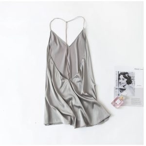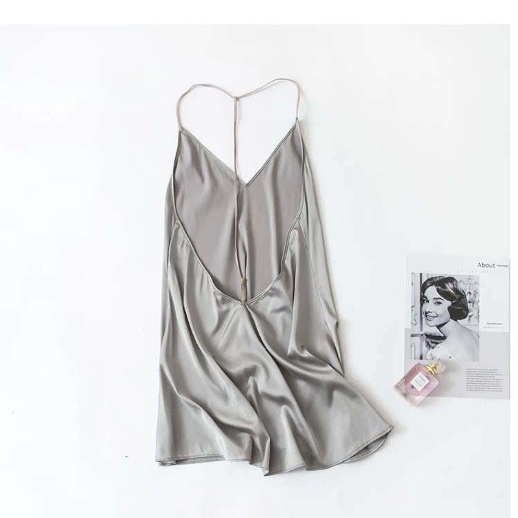 Váy ngủ dây hở lưng chữ T, chất liệu lụa mềm mại. Kiểu dáng độc đáo, cắt cúp táo bạo giúp bạn gái luôn cảm thấy tự tin, thoải mái, mang đến cho bạn gái phong cách nóng bỏng nóng bỏng, quyến rũ. Bốn màu: xanh, xám, hồng, đen (freesize).