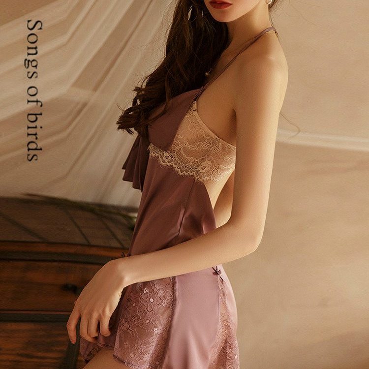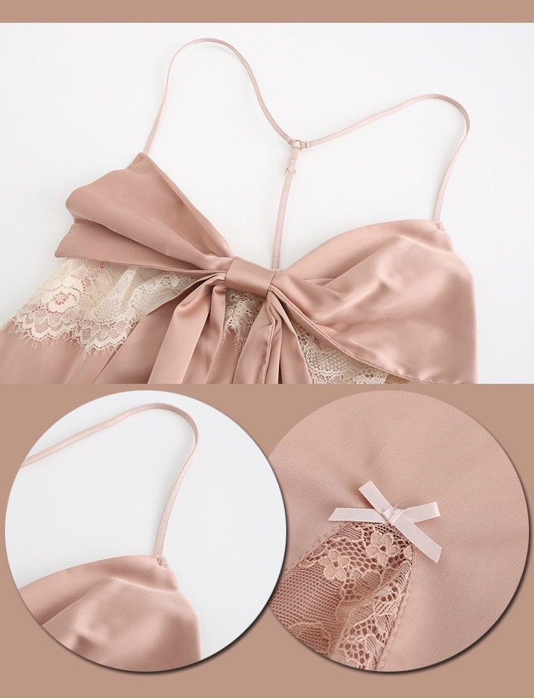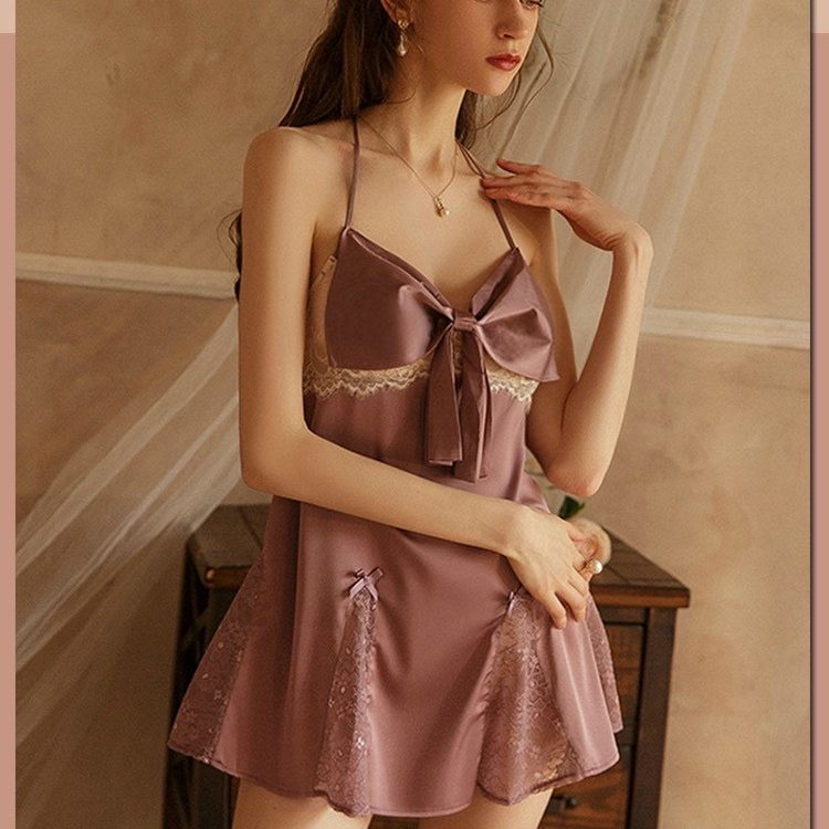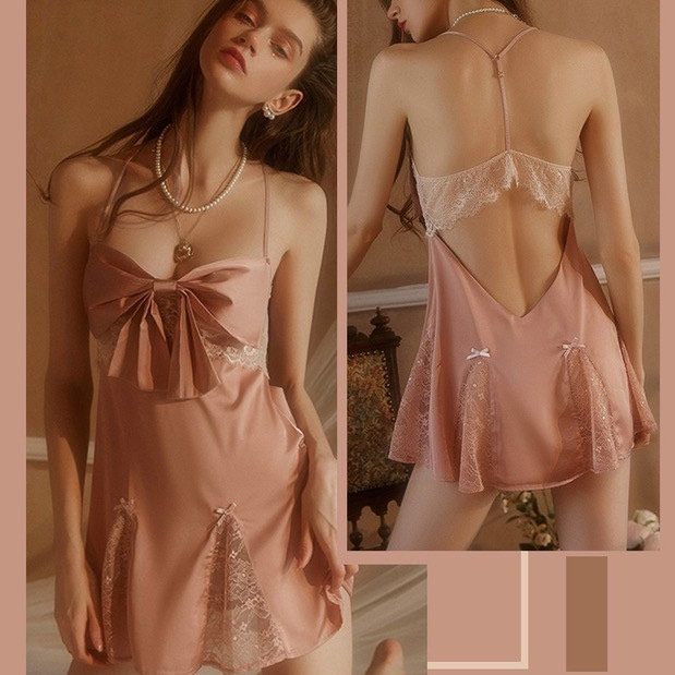 Váy ngủ lụa cao cấp phối ren sắc sảo kiểu dáng trẻ trung đính nơ to cute hở lưng gợi cảm đáng yêu. Màu: hồng, tím.
