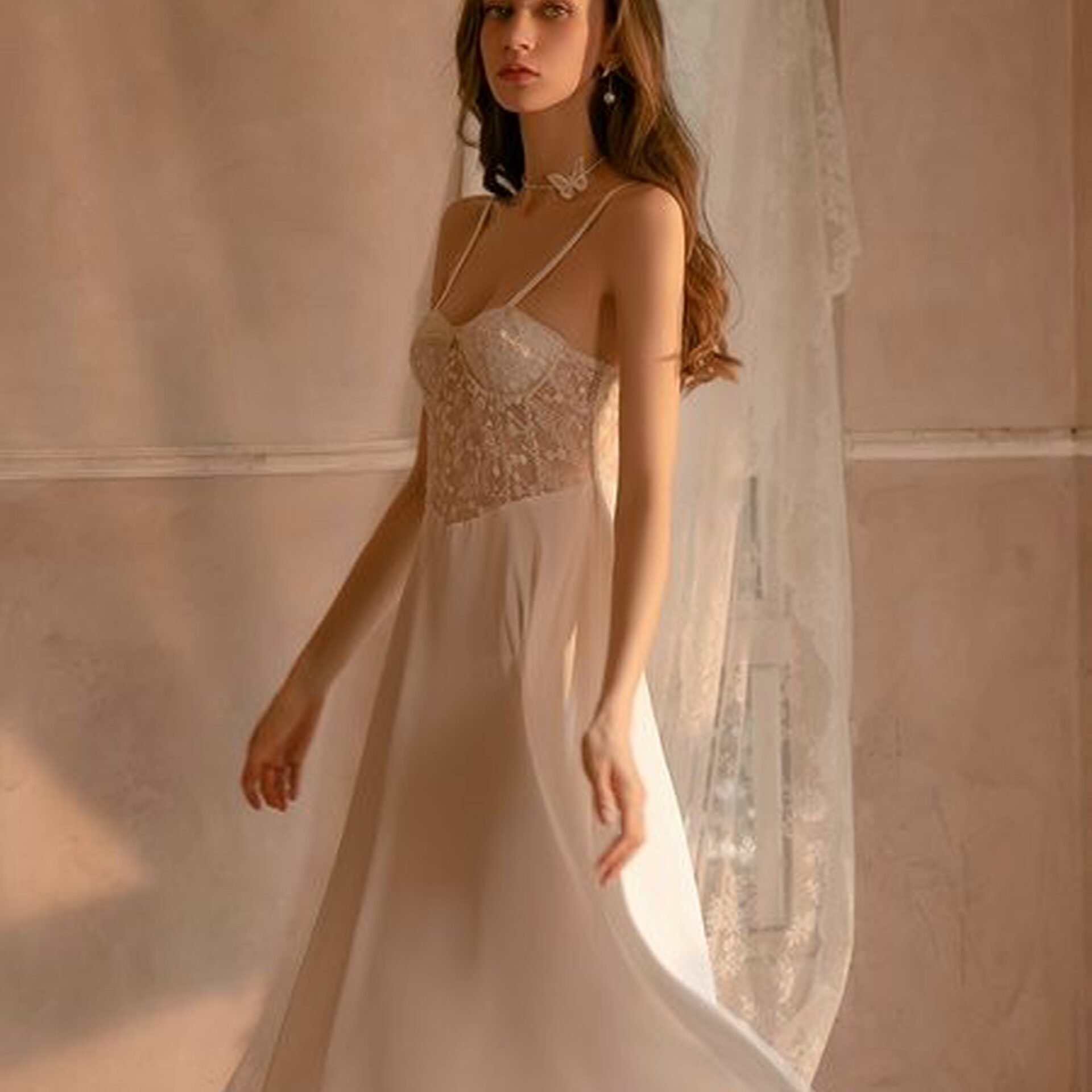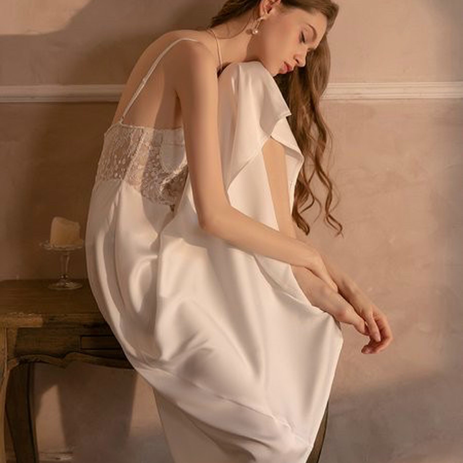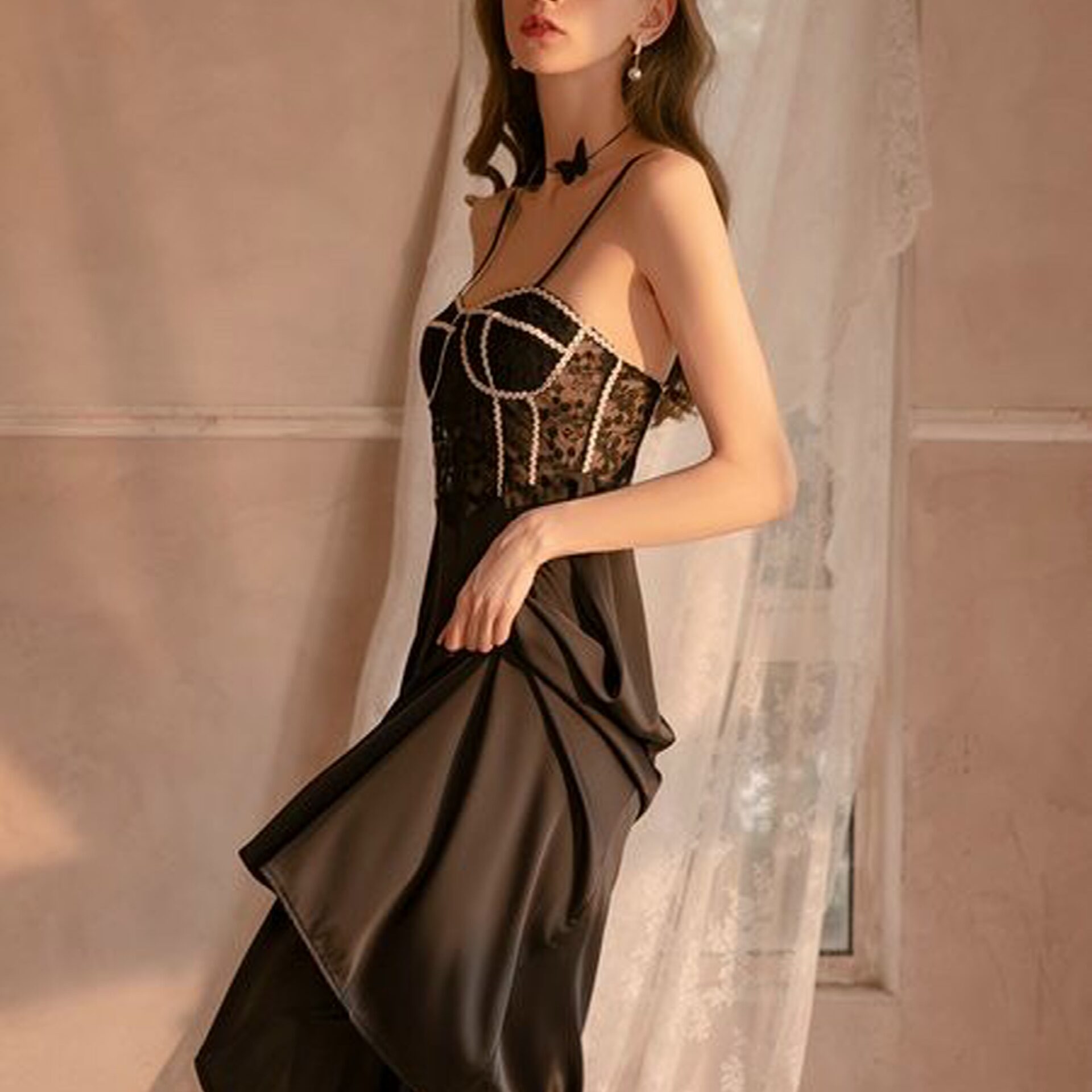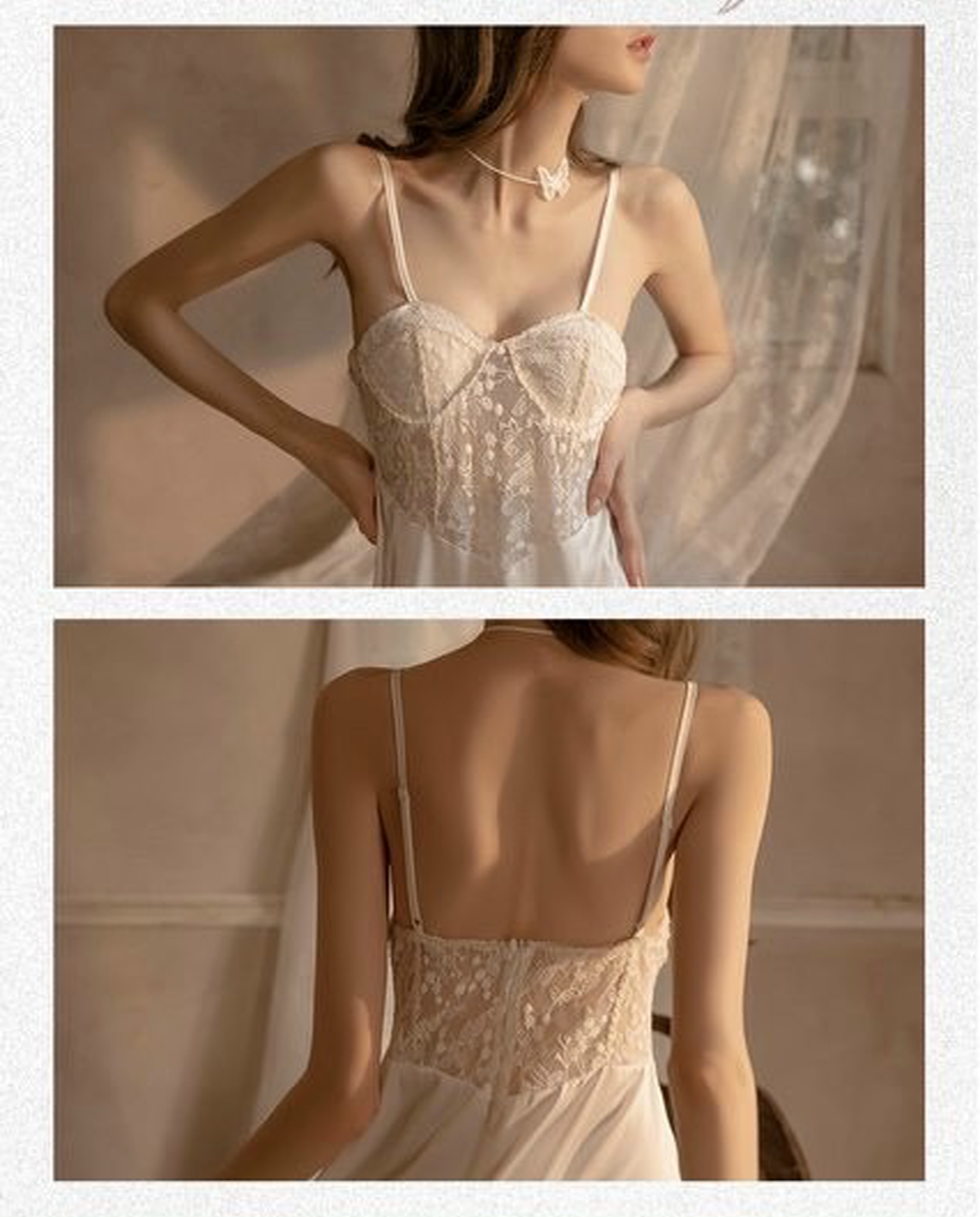 Váy ngủ phi lụa dài mềm mịn phối ren mỏng trong suốt cực sang trọng mang lại cho bạn vẻ đẹp đầy quyến rũ gợi cảm. Màu sắc: đen, trắng.