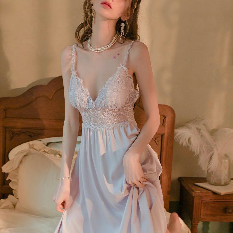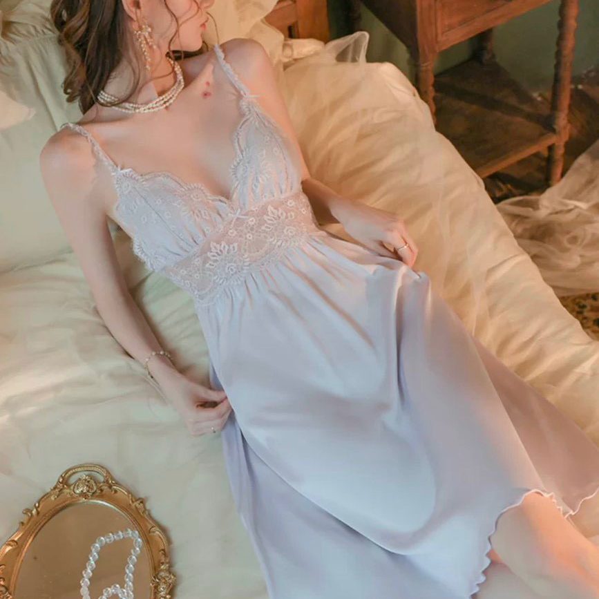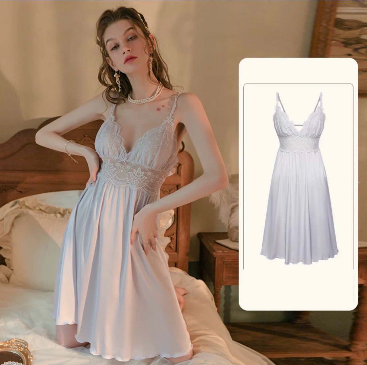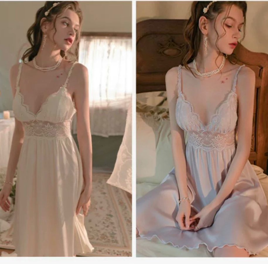 Váy ngủ lụa dài phối ren sang trọng kiểu dáng trẻ trung gợi cảm. Màu sắc: da, tím.