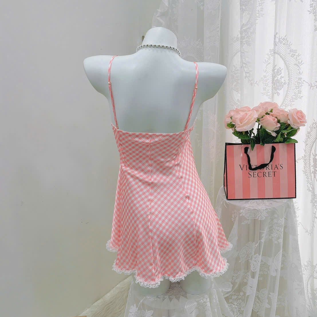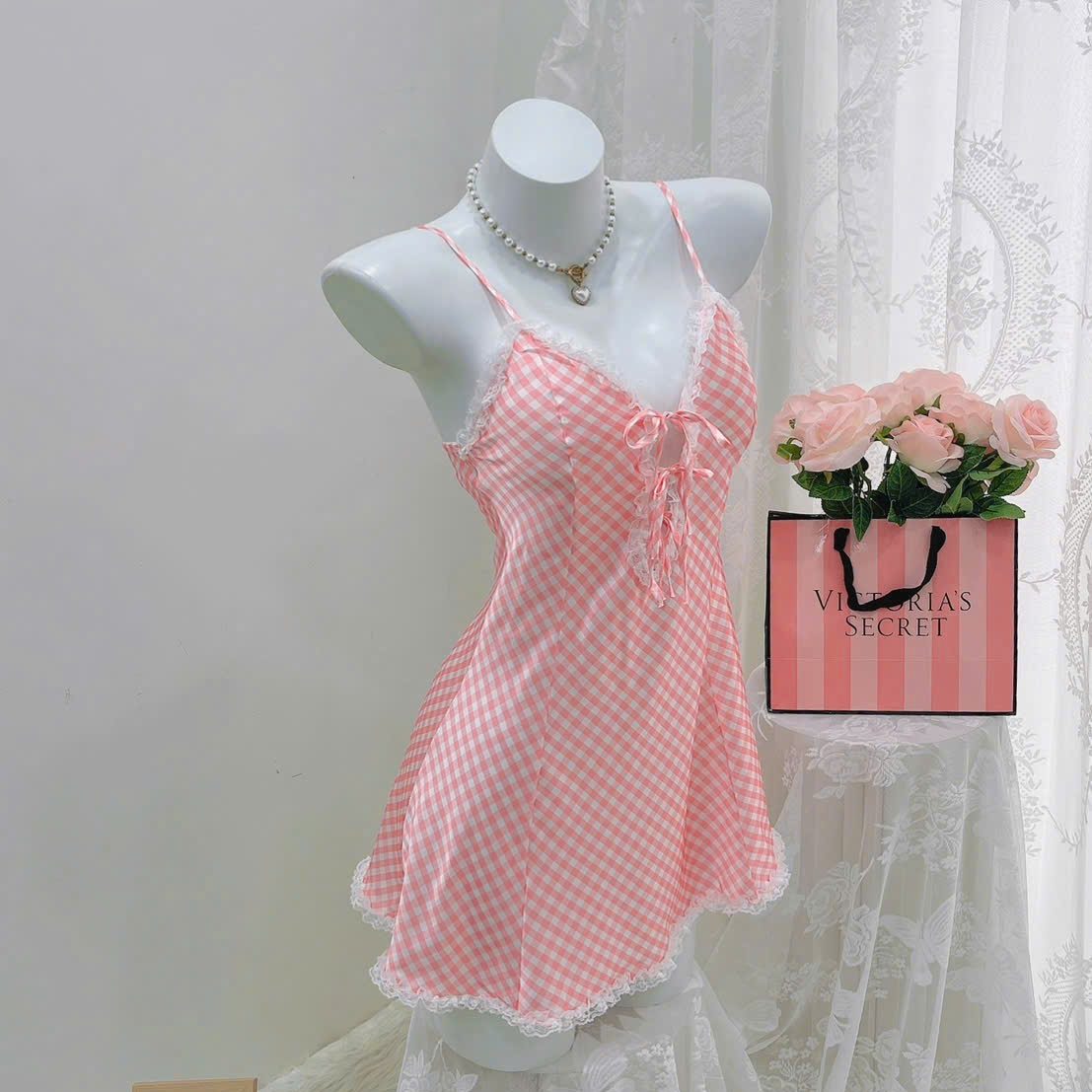 Chiếc đầm ngủ họa tiết caro hồng mang vibe “nàng thơ” nhẹ nhàng nhưng vẫn đủ quyến rũ. Thiết kế ôm nhẹ phần thân trên, xòe mềm phần váy giúp tôn dáng và tạo cảm giác bay bổng, dễ thương.