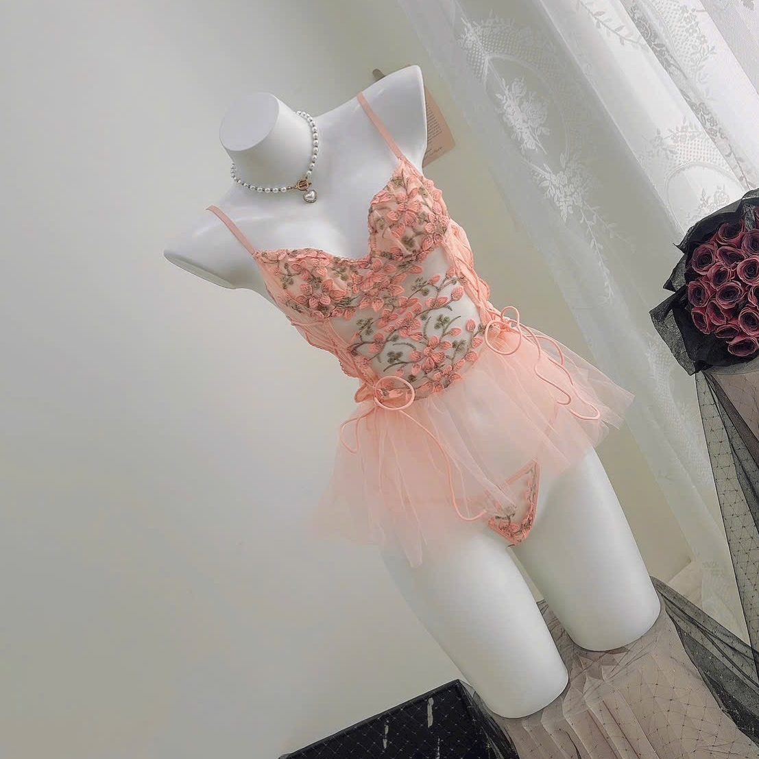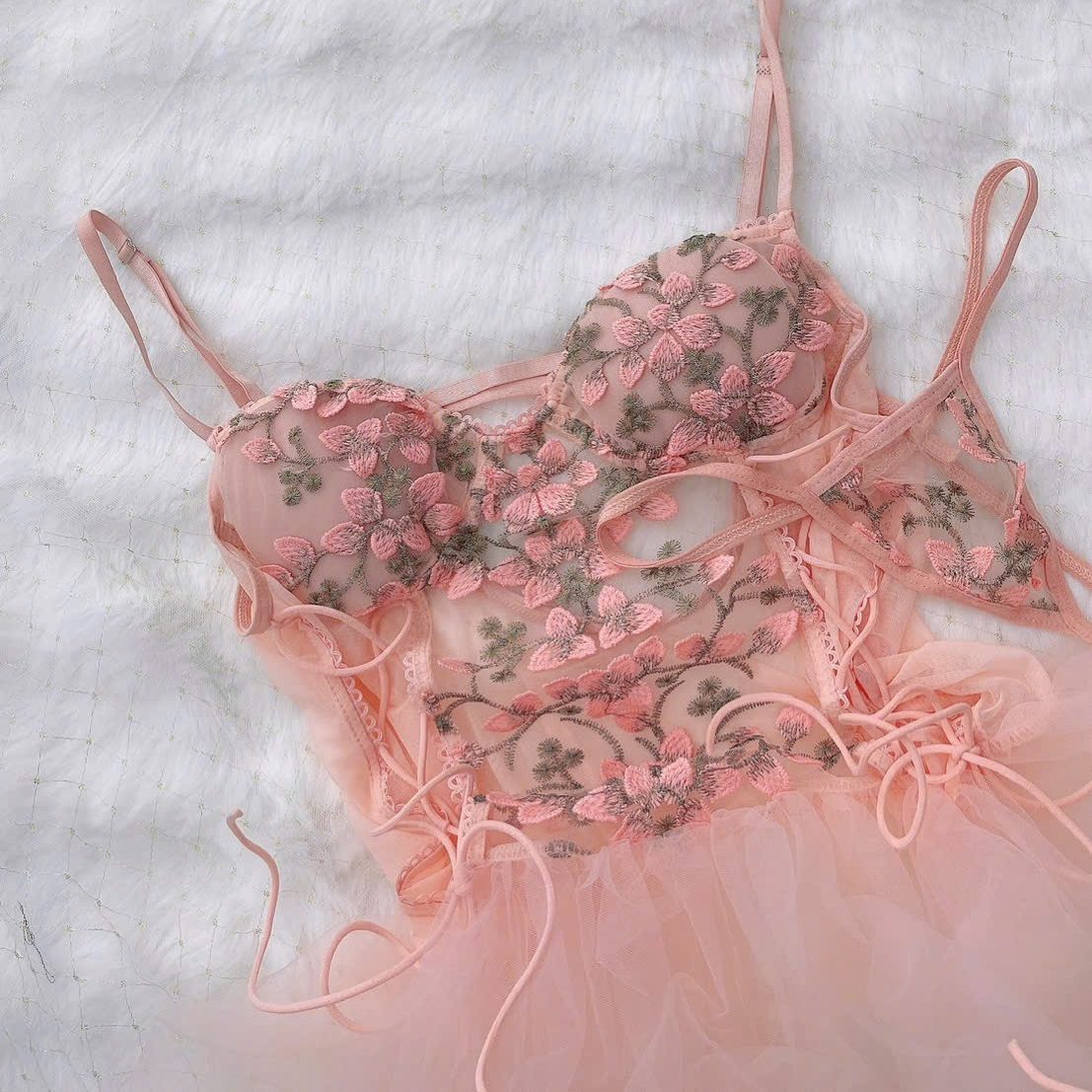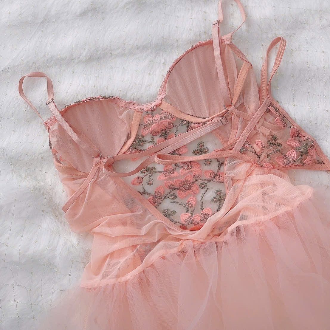 Mẫu đầm ngủ hoa hồng phối voan mang đến vẻ đẹp vừa ngọt ngào vừa quyến rũ. Thiết kế hai dây mảnh tôn bờ vai thanh thoát, phần cup ngực được thêu hoa 3D tinh xảo, ôm nhẹ nhàng giúp tạo form ngực tự nhiên. Thân váy là lớp ren họa tiết hoa mềm mại, kết hợp những đường ruy băng buộc nơ ở eo tạo điểm nhấn nữ tính và cực kỳ duyên dáng. Tầng voan bồng nhẹ phía dưới làm tổng thể trở nên mềm mại như một nàng công chúa. Set có kèm quần ren đồng bộ, phía sau hở lưng nhẹ và dây áo có thể điều chỉnh để ôm dáng thoải mái. Tông hồng pastel ngọt dịu giúp tôn da, mang lại cảm giác nữ tính và lãng mạn, rất phù hợp để mặc ngủ, chụp ảnh hoặc dùng làm quà tặng.
