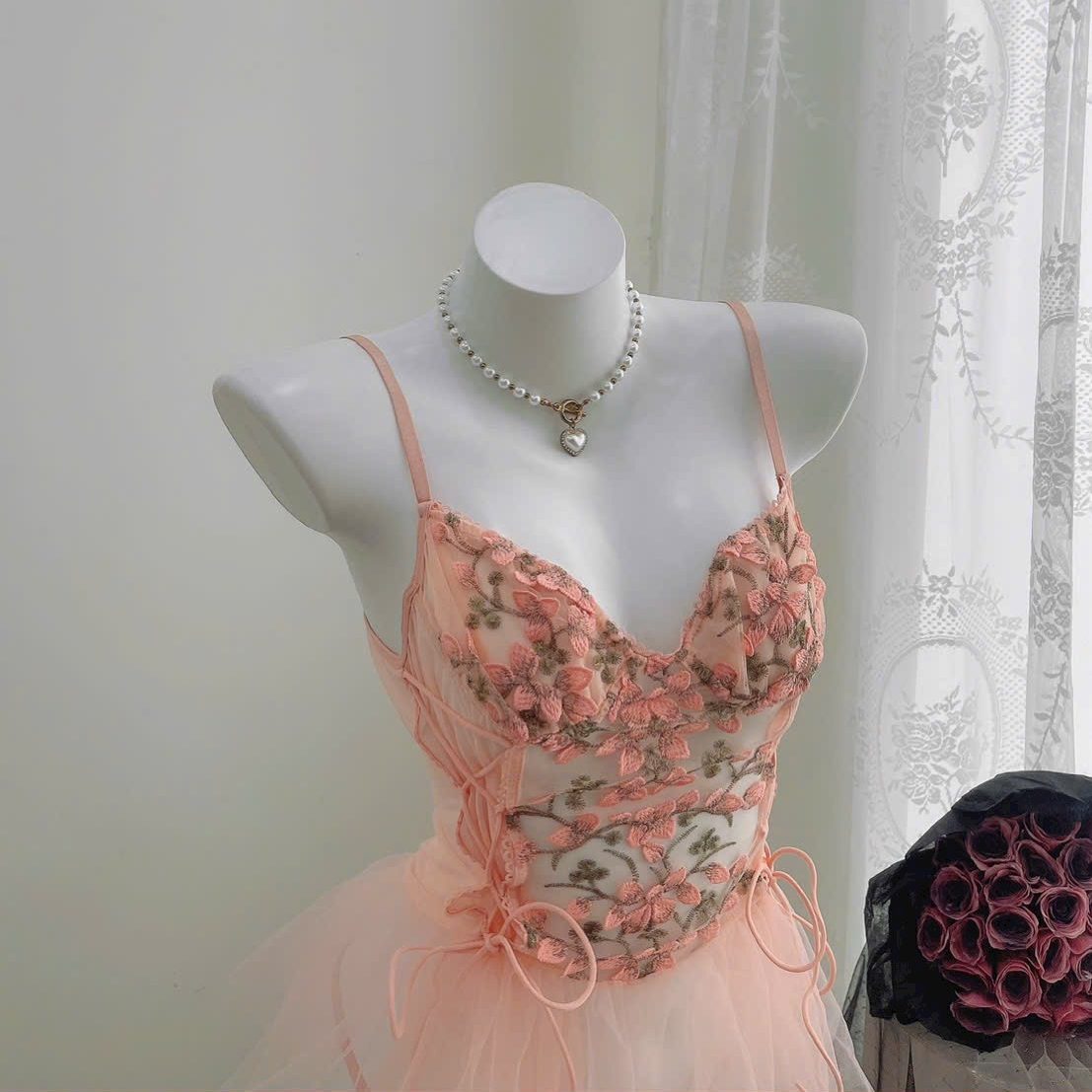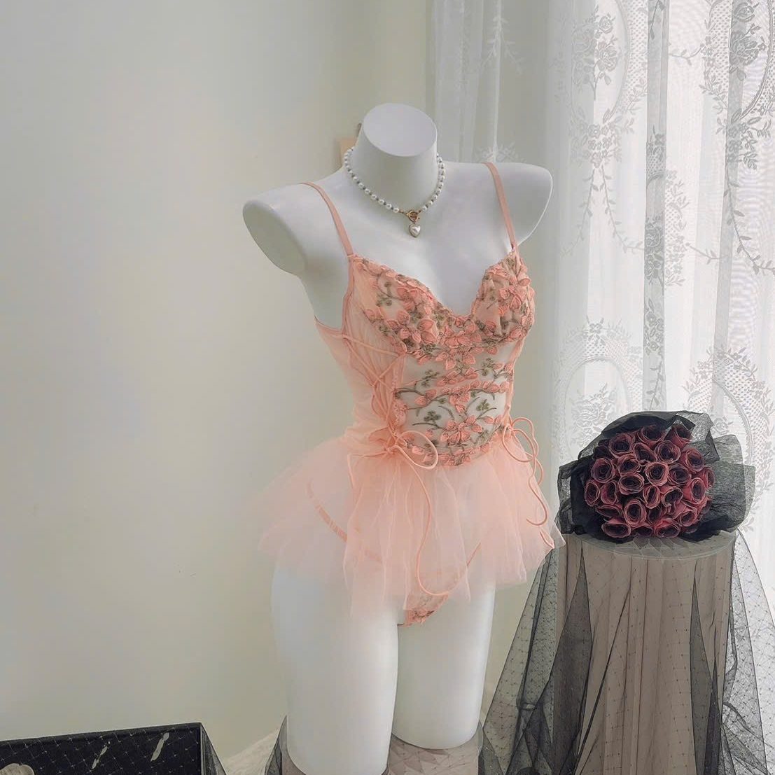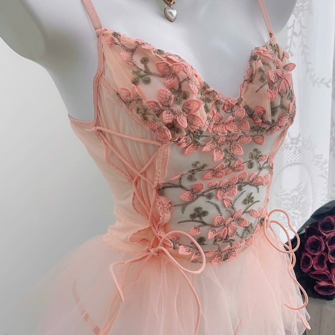 Mẫu đầm ngủ hoa hồng phối voan mang đến vẻ đẹp vừa ngọt ngào vừa quyến rũ. Thiết kế hai dây mảnh tôn bờ vai thanh thoát, phần cup ngực được thêu hoa 3D tinh xảo, ôm nhẹ nhàng giúp tạo form ngực tự nhiên. Thân váy là lớp ren họa tiết hoa mềm mại, kết hợp những đường ruy băng buộc nơ ở eo tạo điểm nhấn nữ tính và cực kỳ duyên dáng. Tầng voan bồng nhẹ phía dưới làm tổng thể trở nên mềm mại như một nàng công chúa. Set có kèm quần ren đồng bộ, phía sau hở lưng nhẹ và dây áo có thể điều chỉnh để ôm dáng thoải mái. Tông hồng pastel ngọt dịu giúp tôn da, mang lại cảm giác nữ tính và lãng mạn, rất phù hợp để mặc ngủ, chụp ảnh hoặc dùng làm quà tặng.