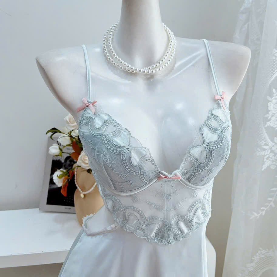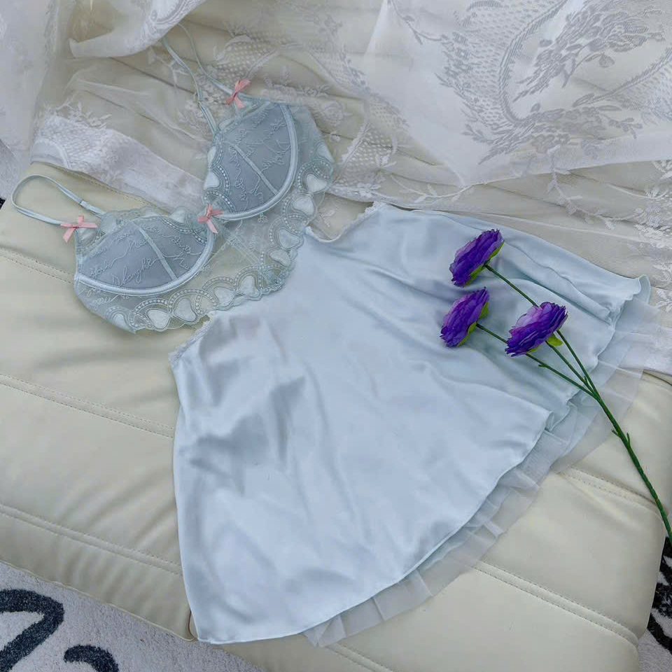 Mẫu váy ngủ lụa phối ren này mang vẻ đẹp ngọt ngào và thanh khiết, với tông xanh pastel nhẹ nhàng rất tôn da. Phần cup ngực được thiết kế bằng ren mềm họa tiết uốn lượn tinh xảo, đính kèm hai nơ hồng nhỏ tạo điểm nhấn dễ thương nhưng vẫn gợi cảm. Chất lụa mềm mịn ôm rủ tự nhiên, giúp váy rơi dáng đẹp và mang lại cảm giác thoải mái khi mặc. Hai bên eo được khoét tinh tế, tạo đường cong mềm mại và giúp vóc dáng trông thon gọn hơn. Phần lưng hở cùng dây áo mảnh điều chỉnh được làm tổng thể trở nên quyến rũ nhưng vẫn giữ sự thanh lịch. Đuôi váy xoè nhẹ, bồng mềm theo từng chuyển động, vừa kín đáo vừa cuốn hút.