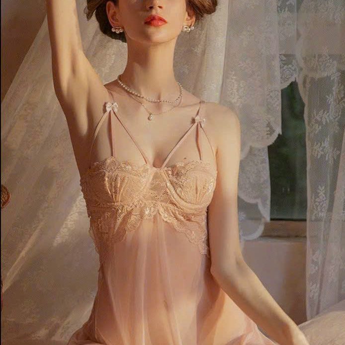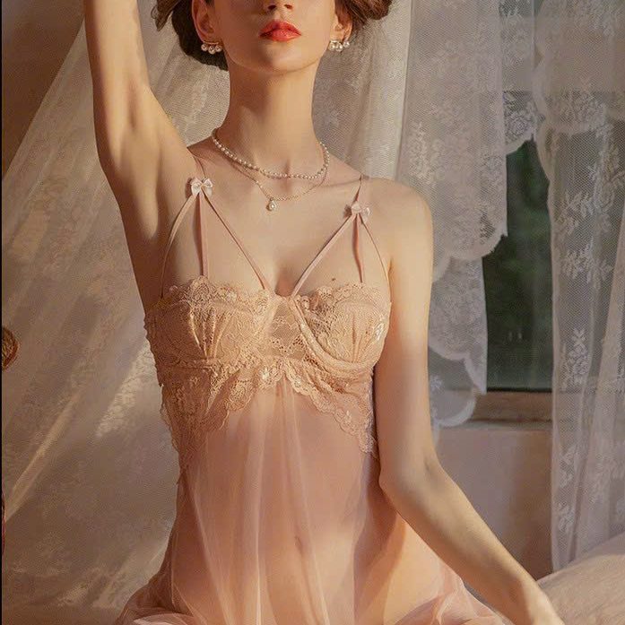 Mẫu váy ngủ ren trong suốt này mang phong cách quyến rũ và tinh tế, được thiết kế với hai tông màu chính là trắng và màu da. Chất liệu ren mềm mại, kết hợp với lớp vải lưới mỏng nhẹ, giúp tôn lên vẻ gợi cảm nhưng vẫn giữ được nét thanh lịch.