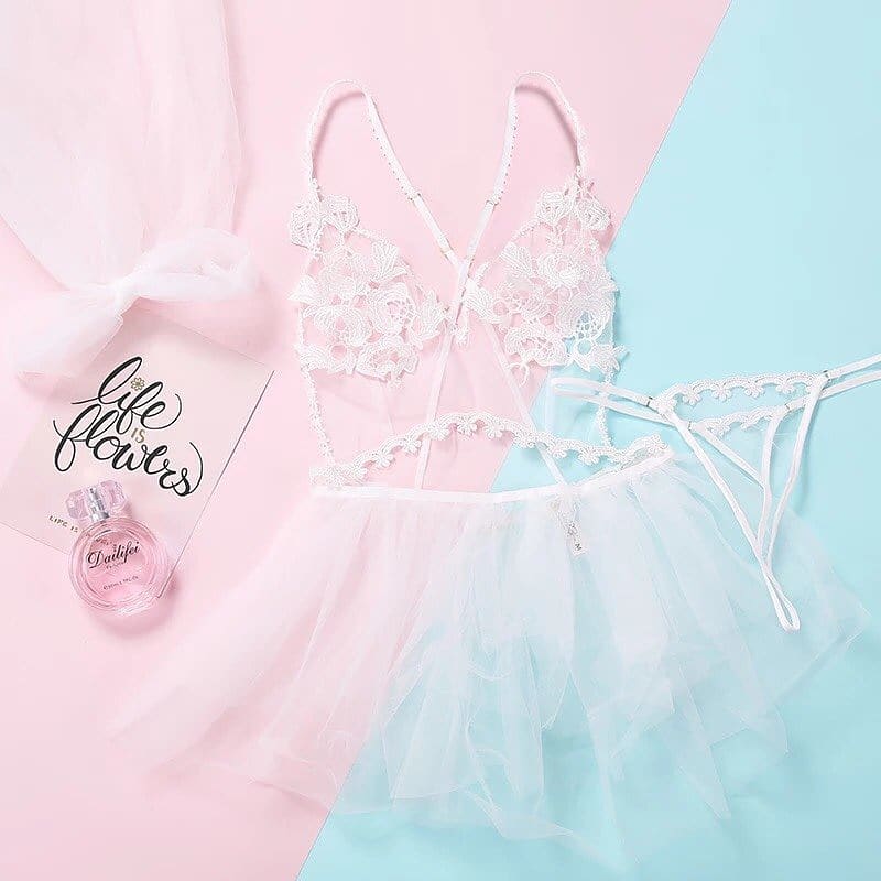 Váy ngủ ren trắng thiết kế kiểu dáng táo bạo sẽ khiến trái tim chàng thổn thức khi nàng khoác lên người nhé. (có kèm vớ) (freesize)